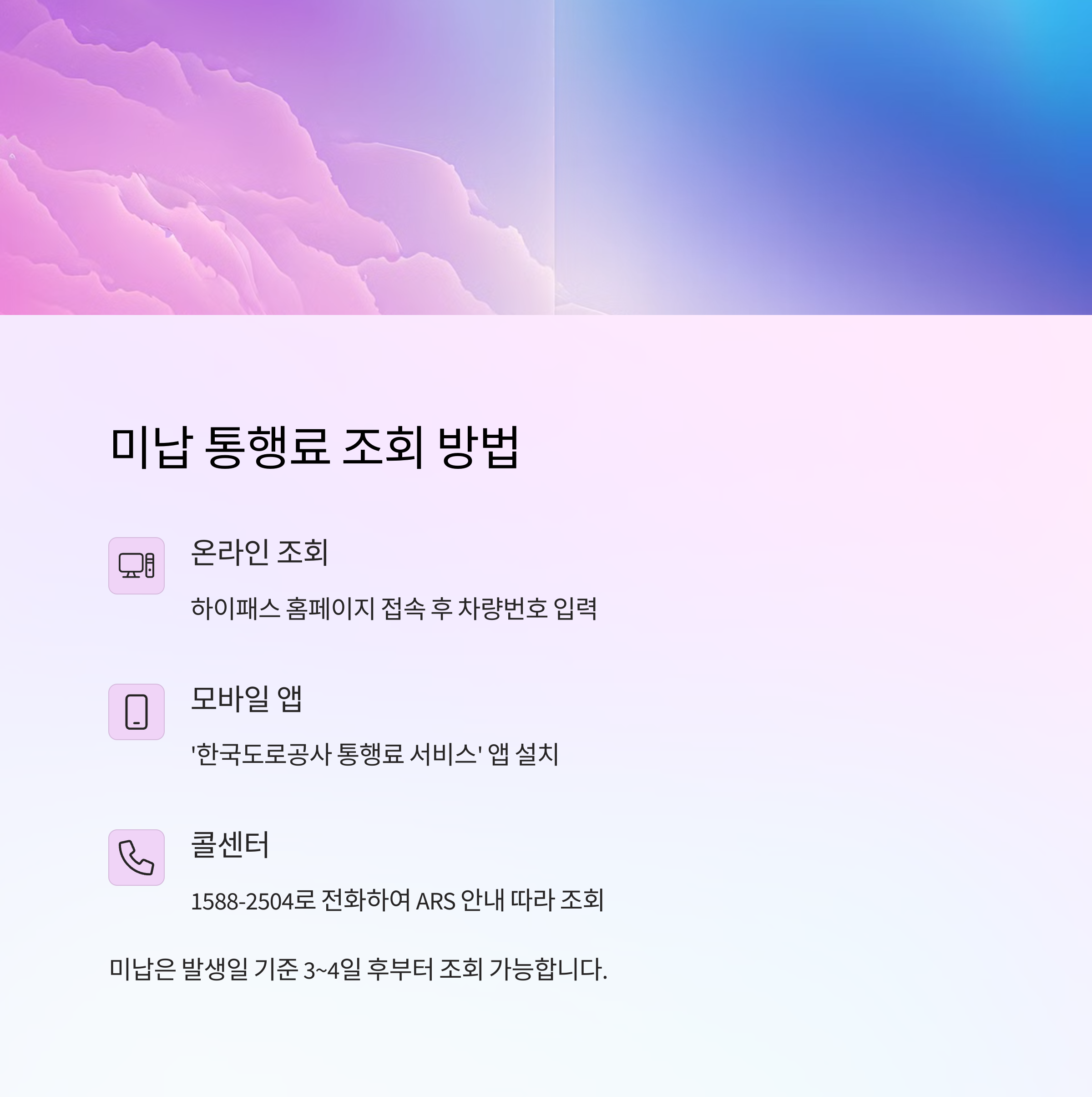 - 미납 조회: 고속도로 통행료 홈페이지, 앱, 콜센터, 영업소 활용
