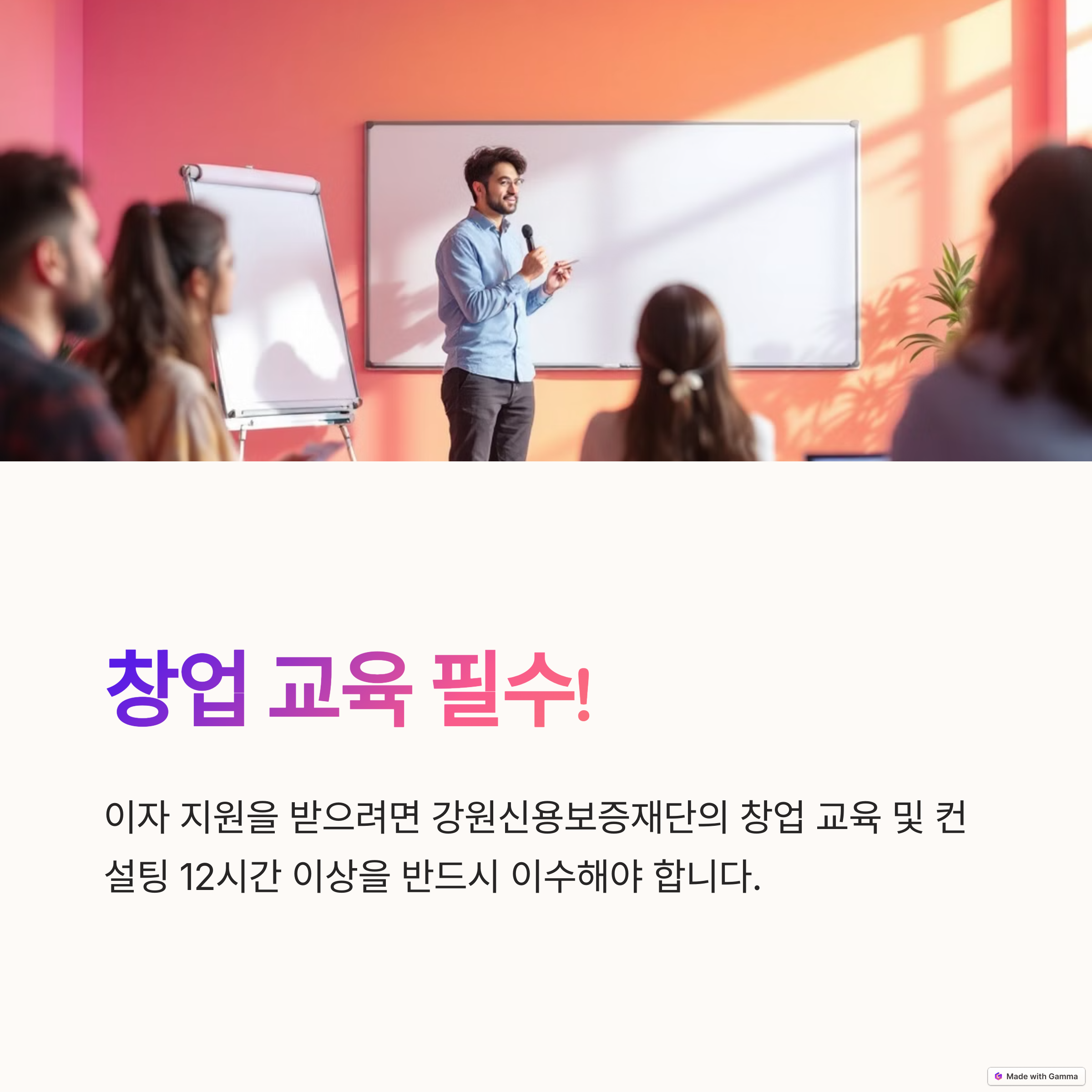 이자 지원을 받기 위해서는 강원신용보증재단에서 진행하는 창업 교육 및 컨설팅 12시간 이상 이수해야 합니다. 해당 교육에서는 창업 실무와 경영 전략을 배울 수 있으며, 창업 성공률을 높이는 데 도움을 줍니다.