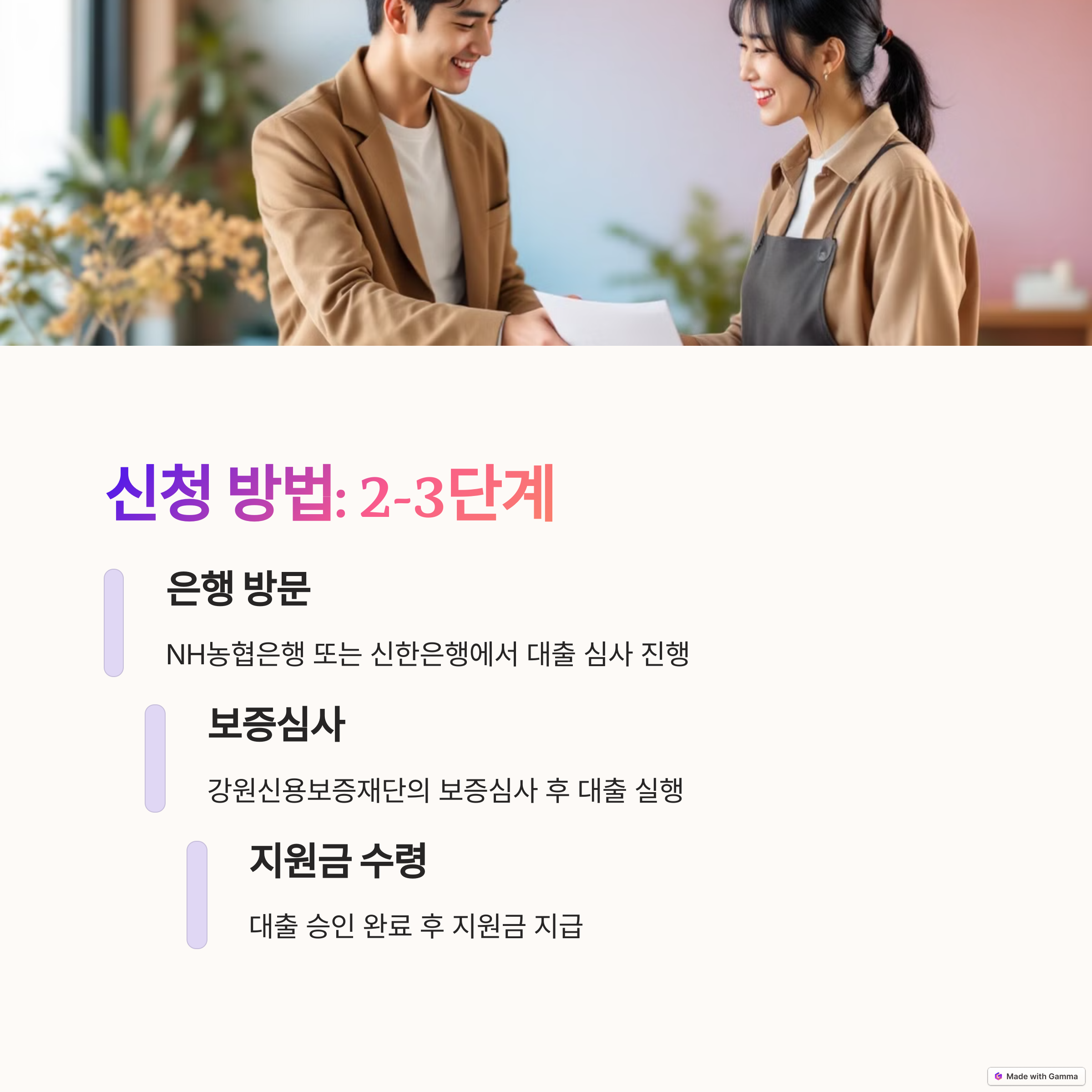 - 이자 지원 조건: 강원신용보증재단의 창업 교육 및 컨설팅 12시간 이상 이수 필수