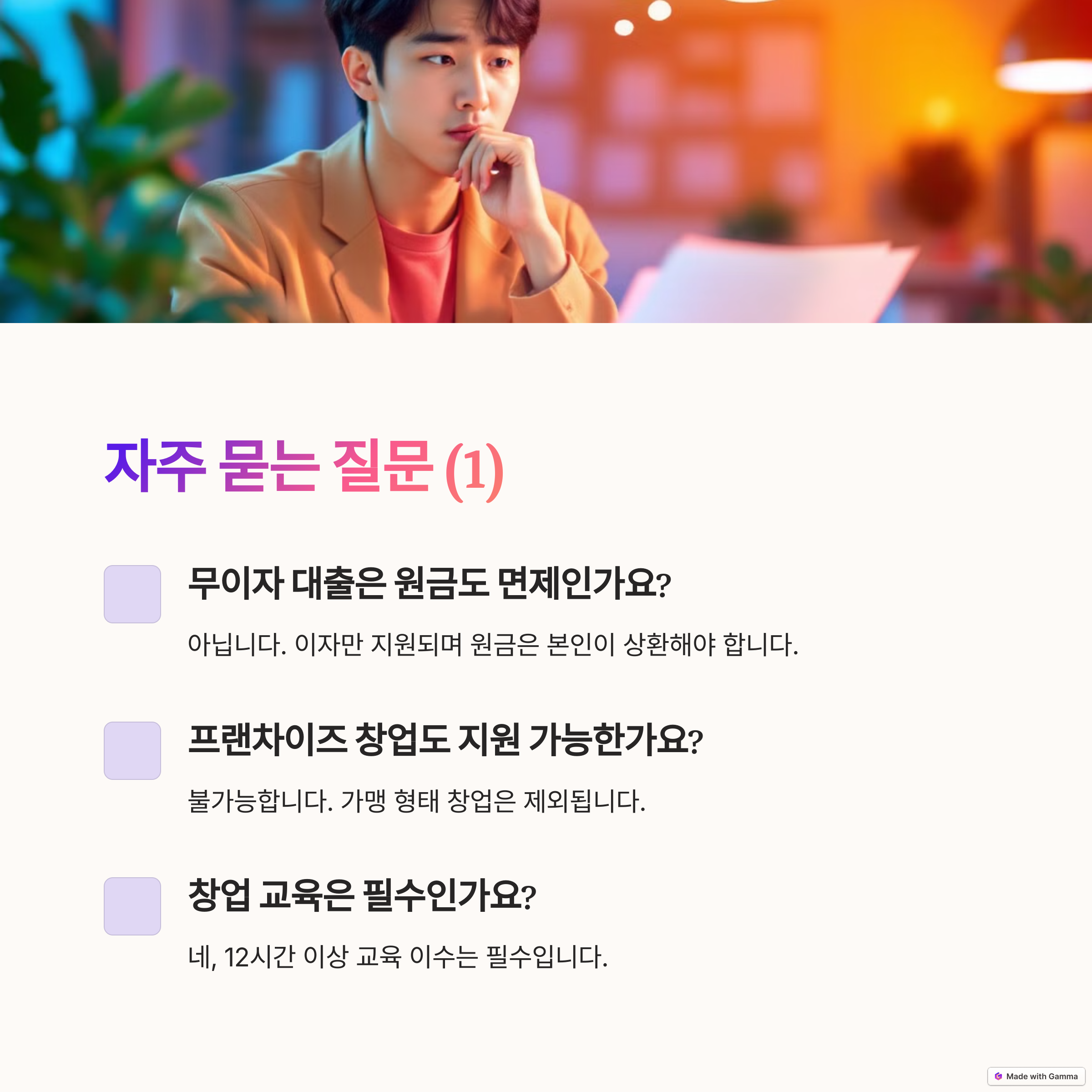 A3. 네. 이자 지원을 받으려면 12시간 이상의 창업 교육 및 컨설팅을 필수로 이수해야 합니다.