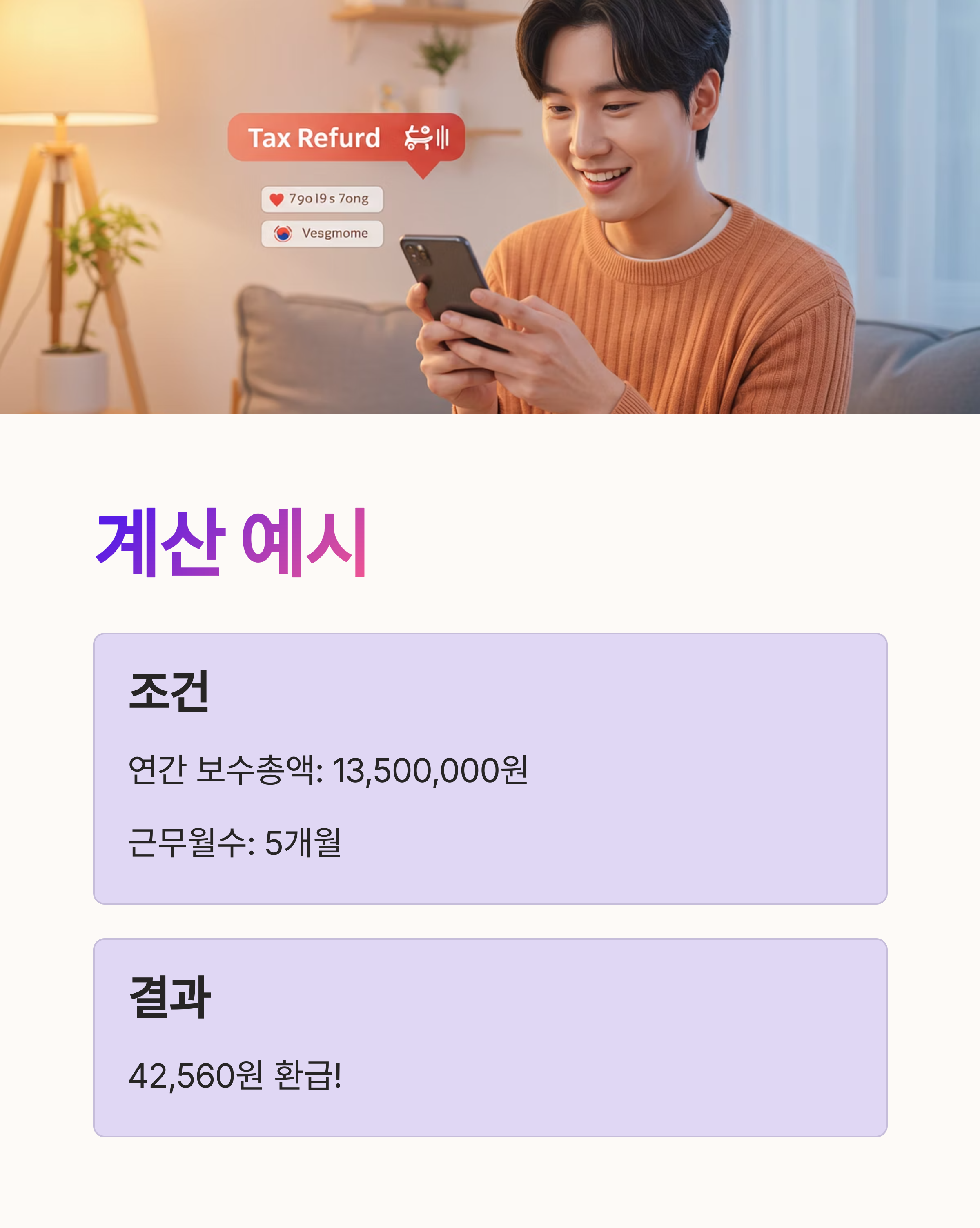 💡 예시 연간 보수총액: 13,500,000원 근무월수: 5개월 계산결과: 추가납부가 아닌 42,560원 환급!