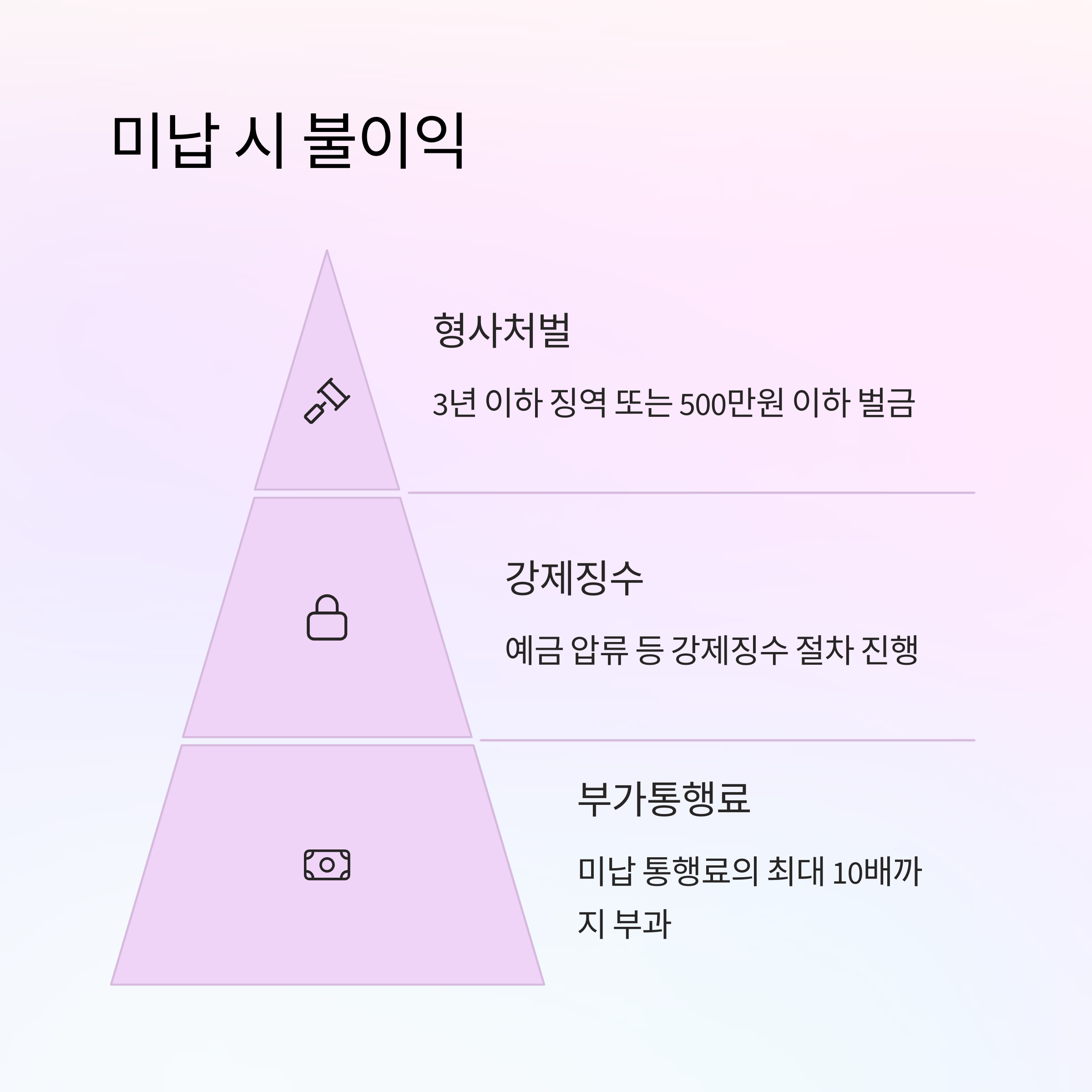 고속도로 통행료 홈페이지를 통해 미납 사실을 확인하지 않을 경우 다음과 같은 불이익이 발생할 수 있습니다. 미리 확인하고 제때 납부하는 것이 중요합니다.