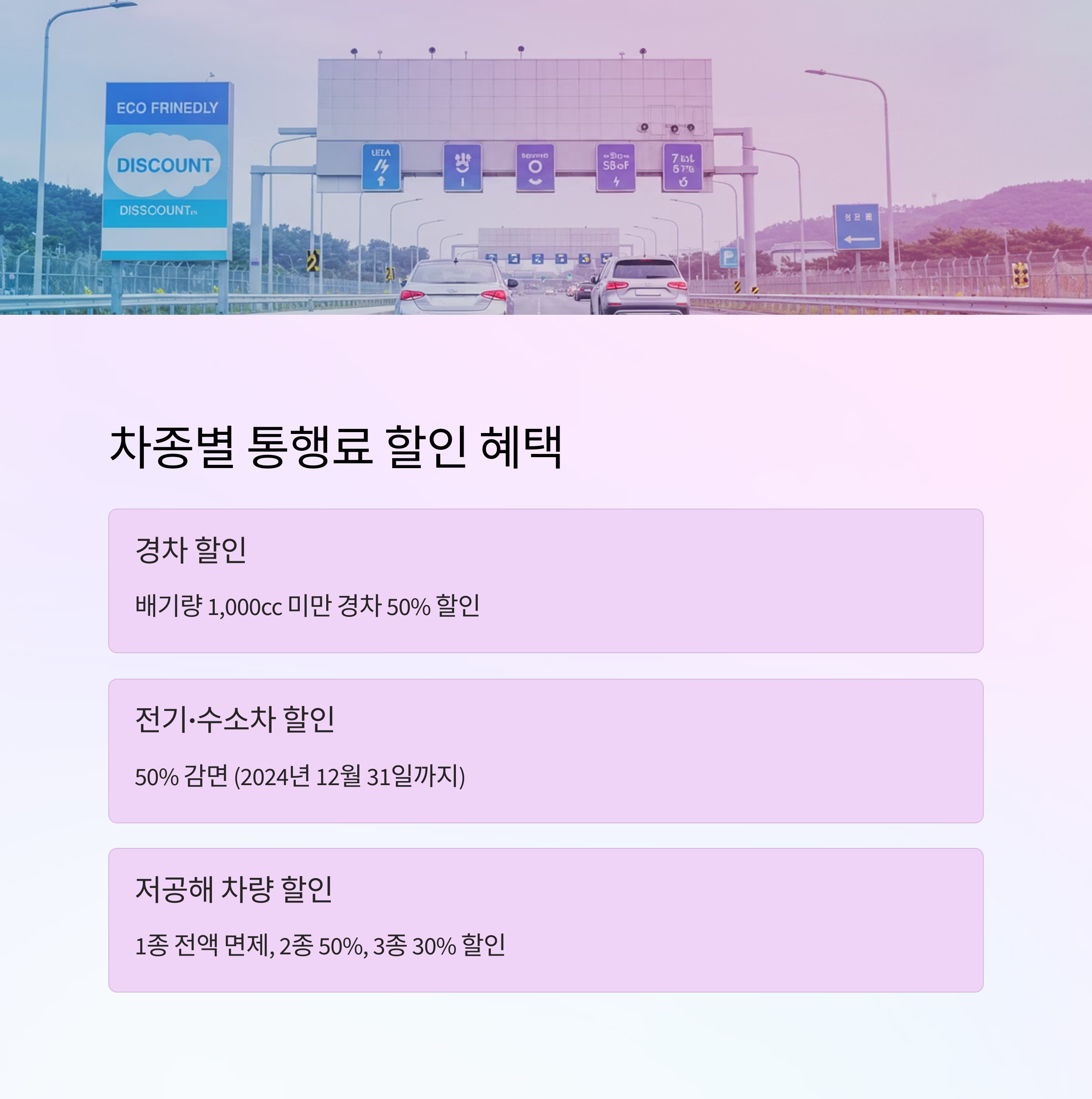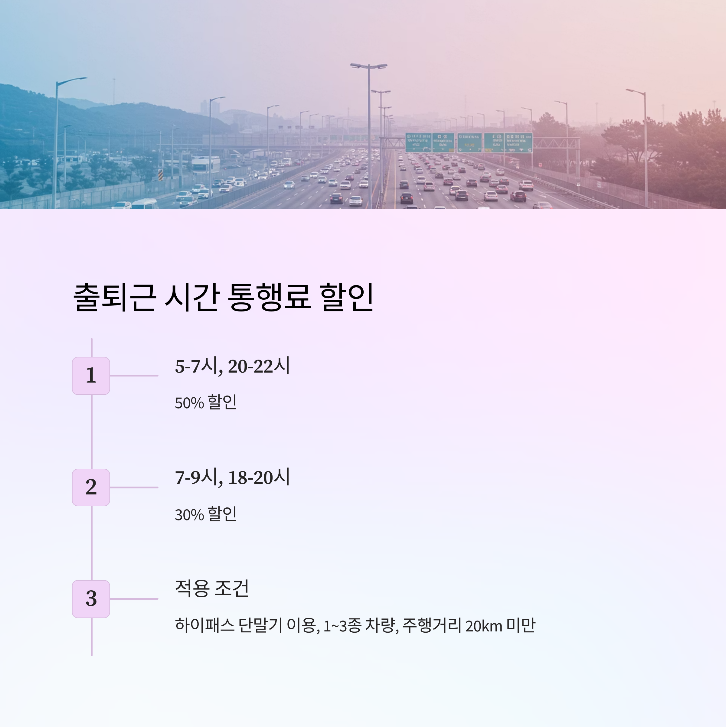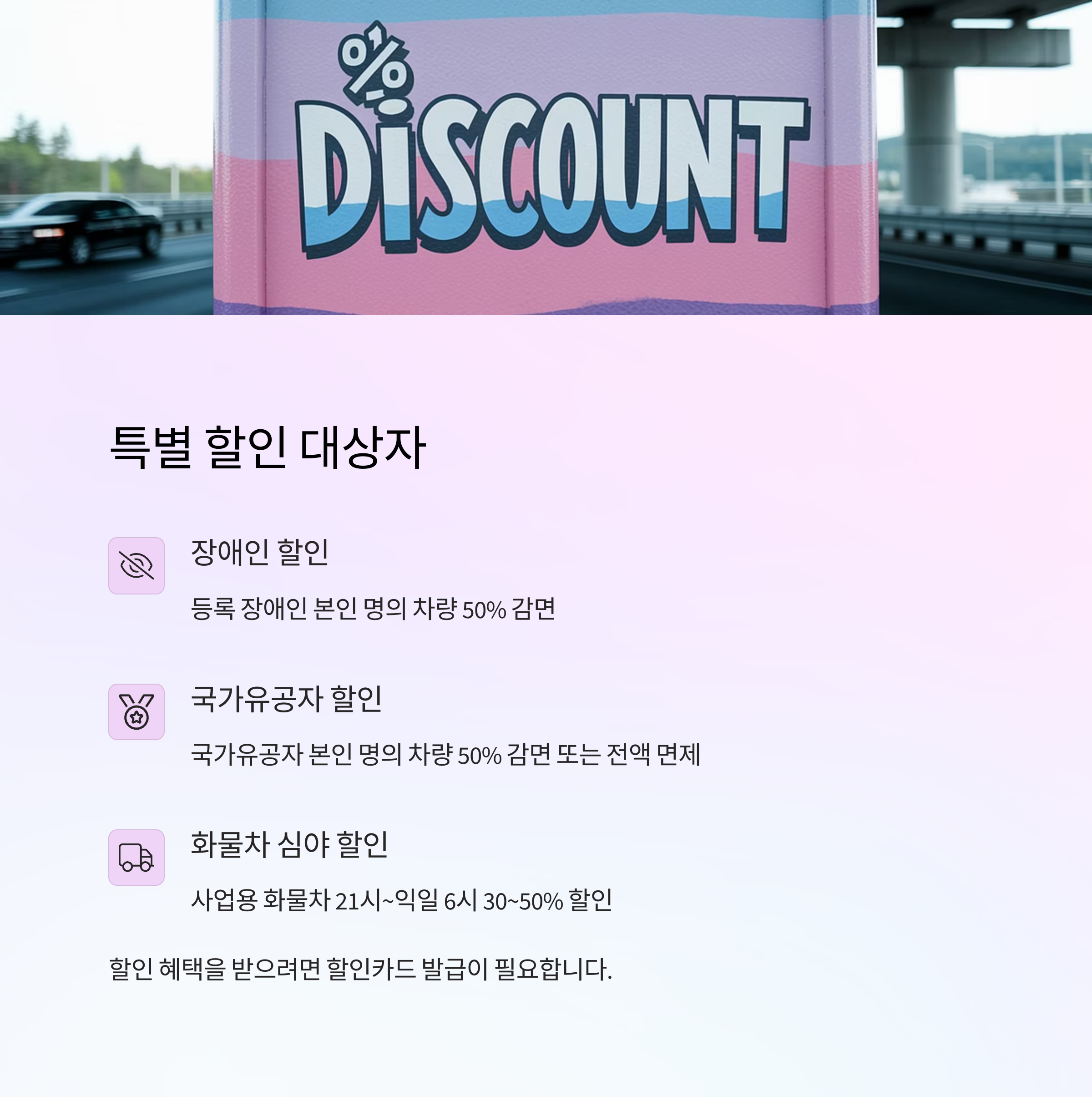 - 할인 방법: 출퇴근 시간, 경차, 전기·수소차, 장애인, 심야 화물차, 저공해 차량 등
