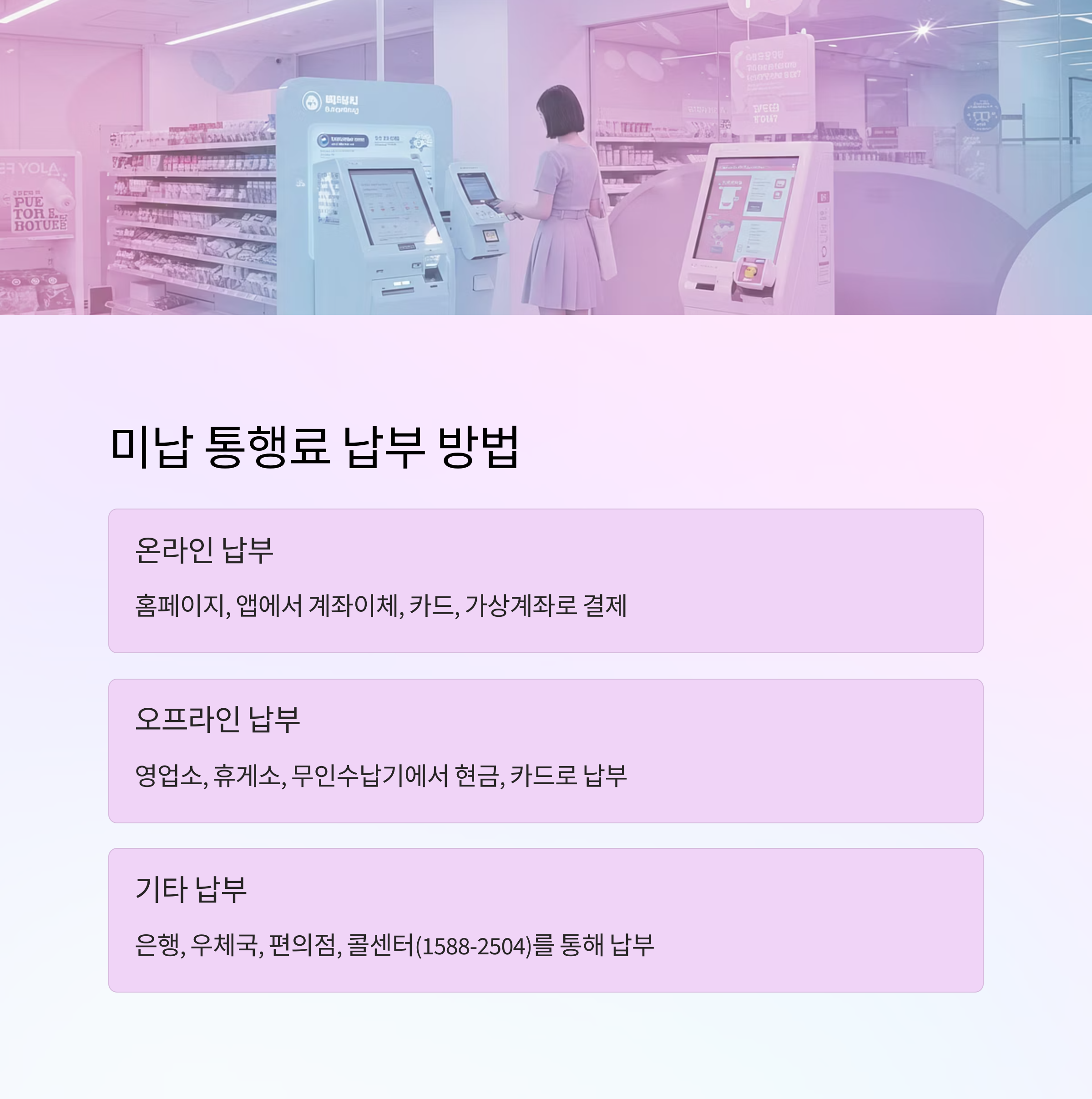 미납 통행료는 고속도로 통행료 홈페이지를 포함한 다양한 방법으로 간편하게 납부할 수 있습니다. 각 방법별 결제 수단도 다양하게 준비되어 있습니다.