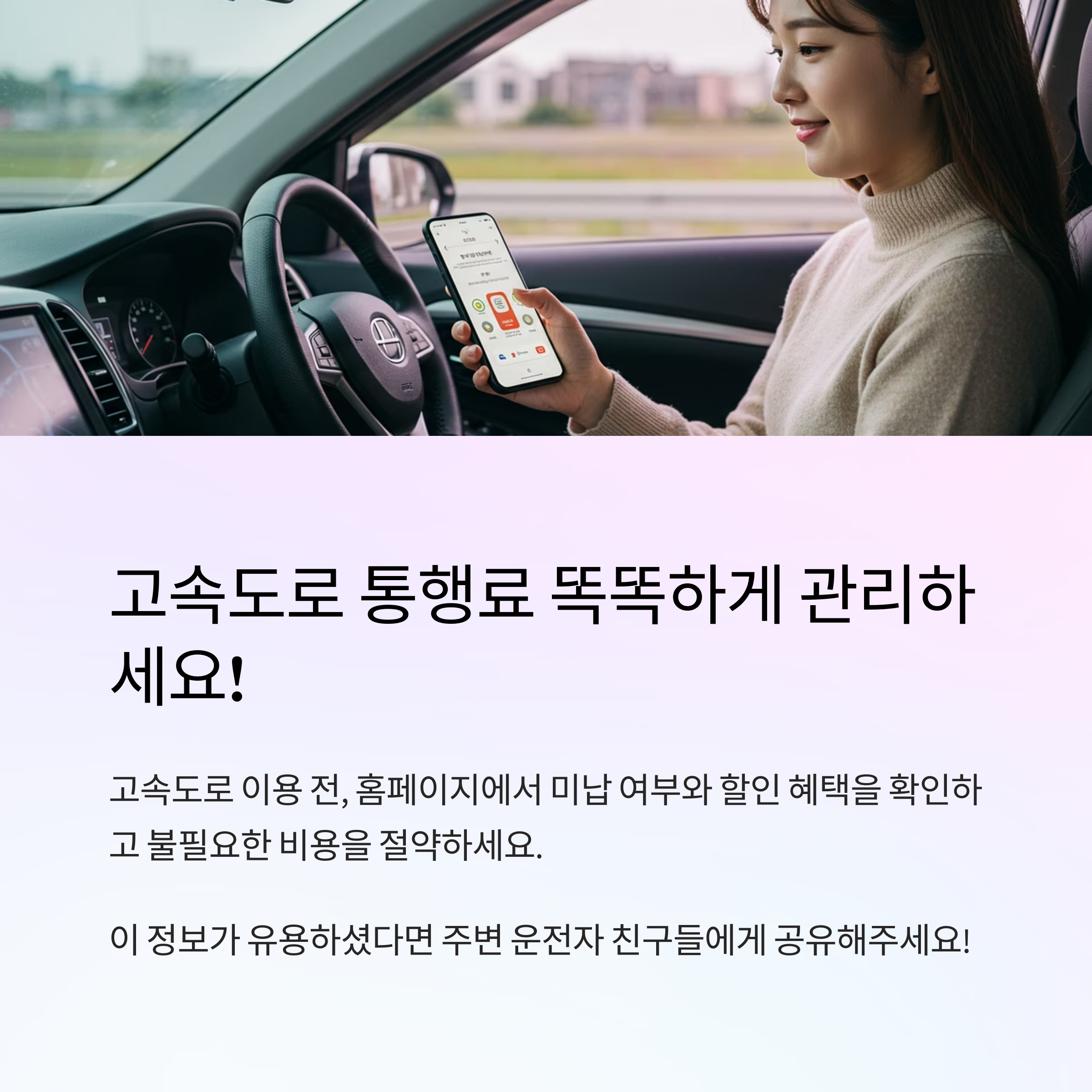 다음에는 고속도로 이용 전, 고속도로 통행료 홈페이지에서 통행료 미납 여부와 할인 혜택을 꼭 체크하고 똑똑하게 절약하세요!