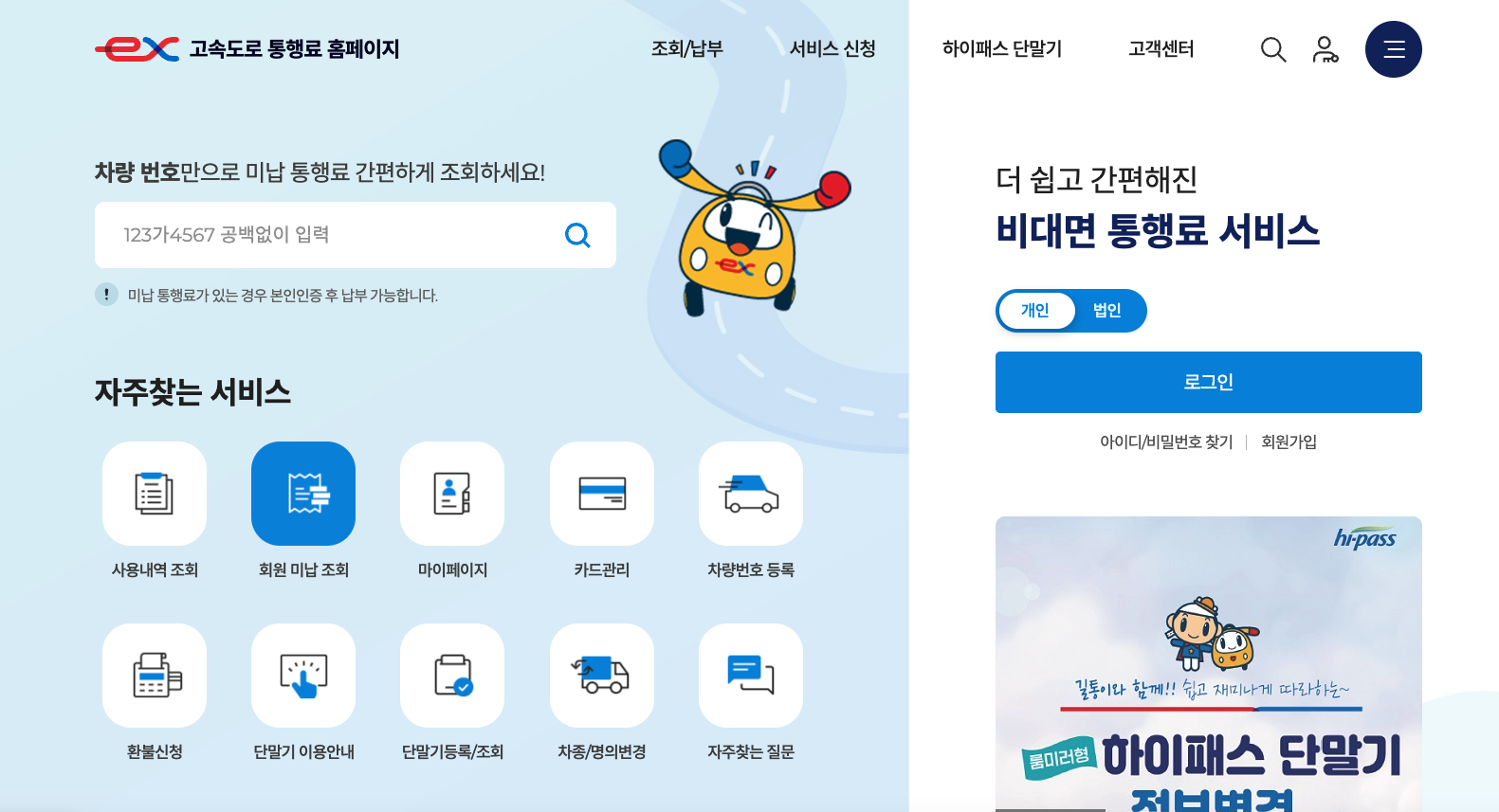 고속도로 통행료 홈페이지를 통해 하이패스 미납 조회 및 납부를 간편하게 처리할 수 있습니다. 이 홈페이지는 통행료 관련 모든 서비스를 한 곳에서 제공합니다.