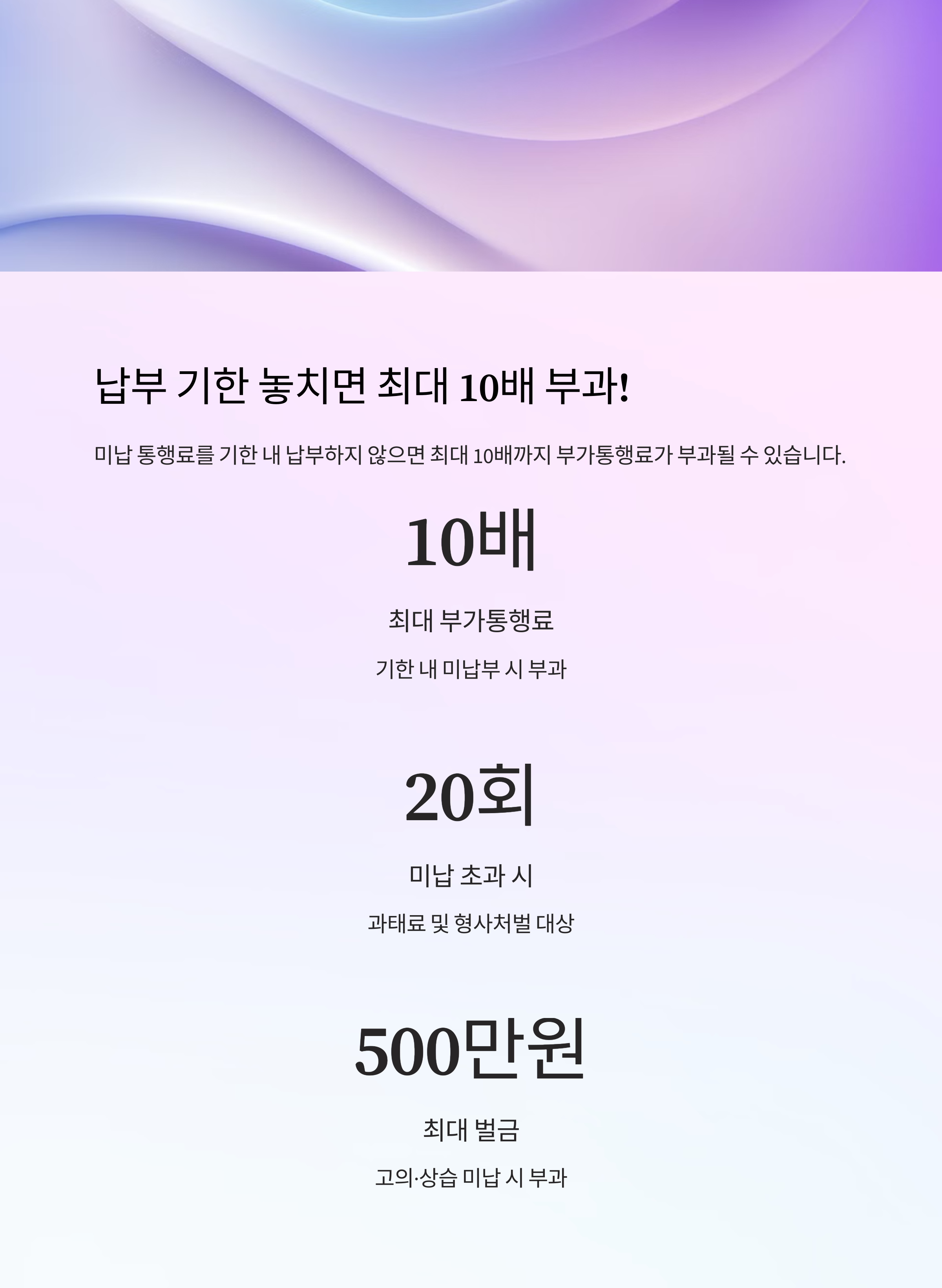 납부기한을 넘길 경우, 최대 10배까지 부가통행료가 부과될 수 있으므로 기한 내 납부가 필수입니다.