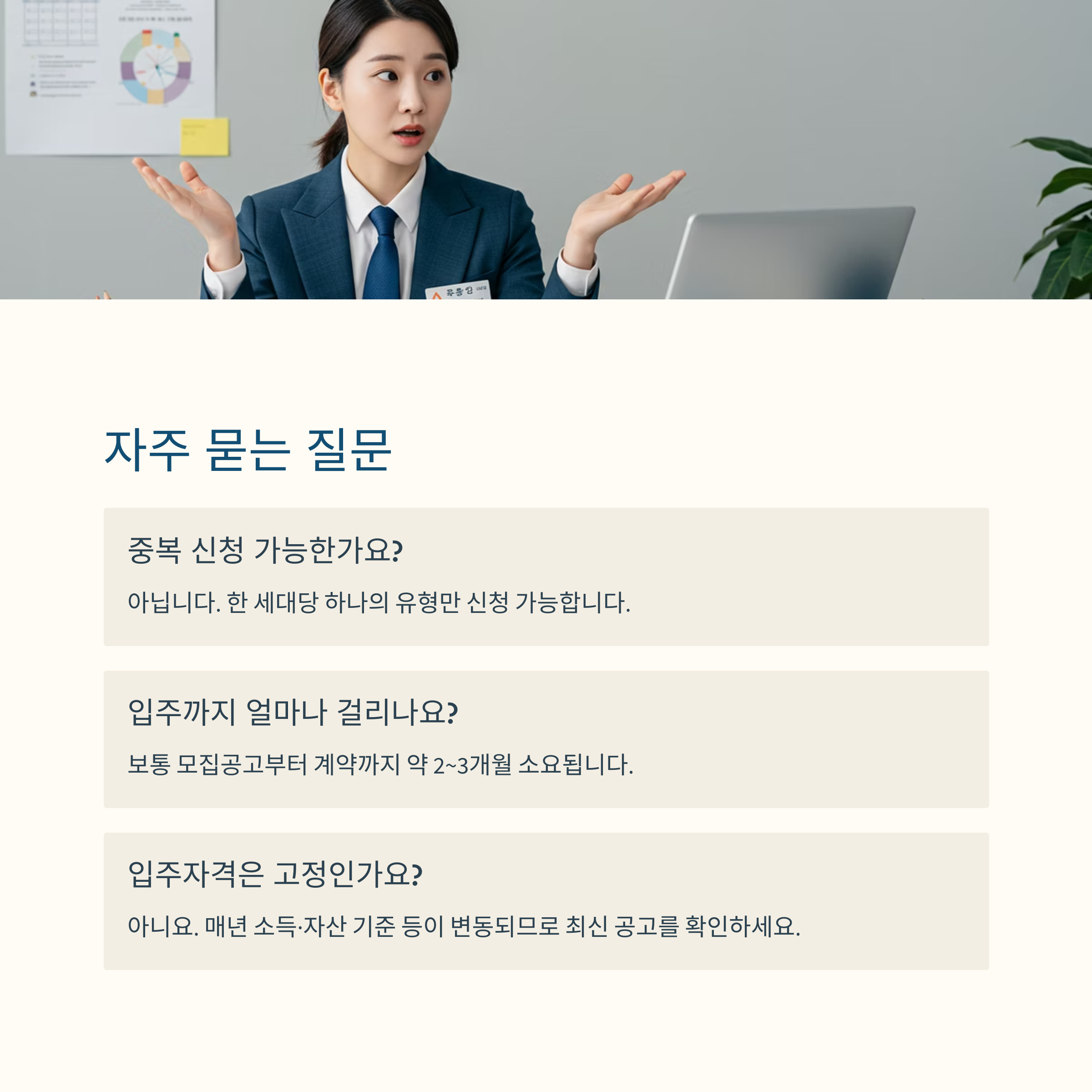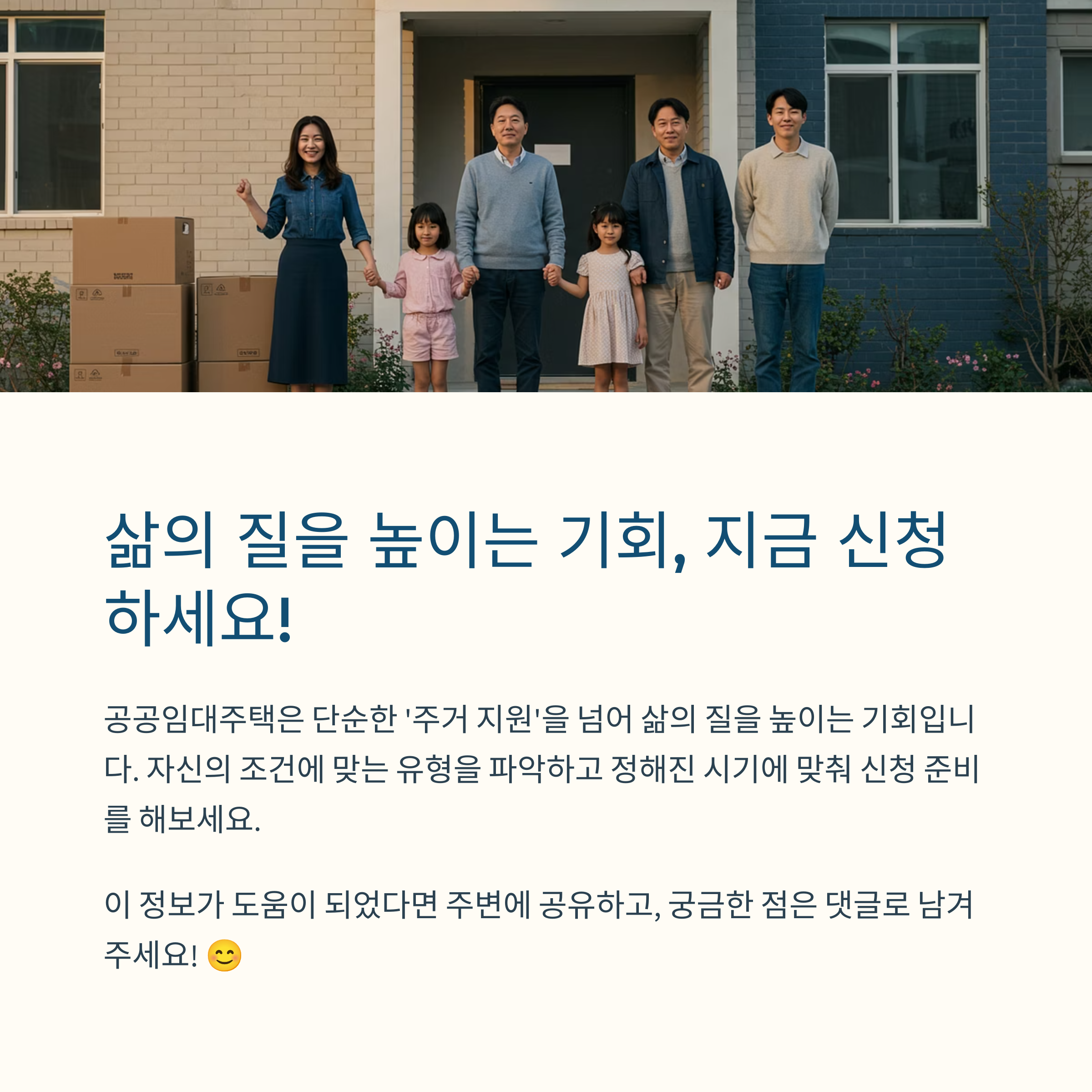 공공임대주택은 단순한 ‘주거 지원’을 넘어, 삶의 질을 높이는 기회가 될 수 있습니다. 자신의 조건에 맞는 유형을 파악하고, 정해진 시기에 맞춰 신청 준비를 해보세요. 특히, 공공임대주택 입주자격은 유형마다 다르고 달라질 수 있으니 반드시 확인하세요. 추가로 궁금한 점은 댓글로 남겨주세요! 😊