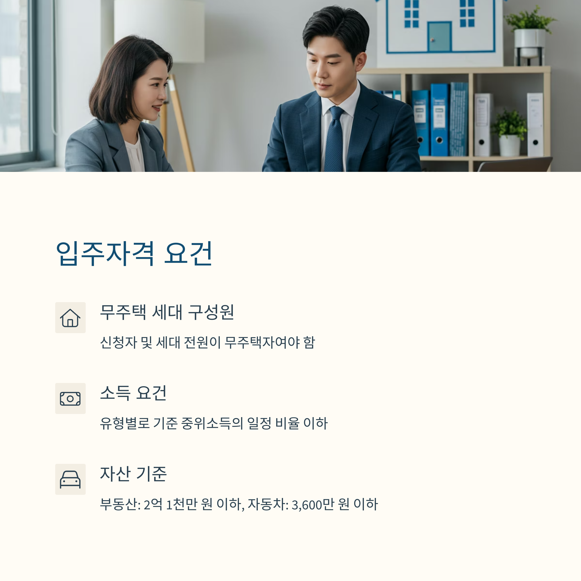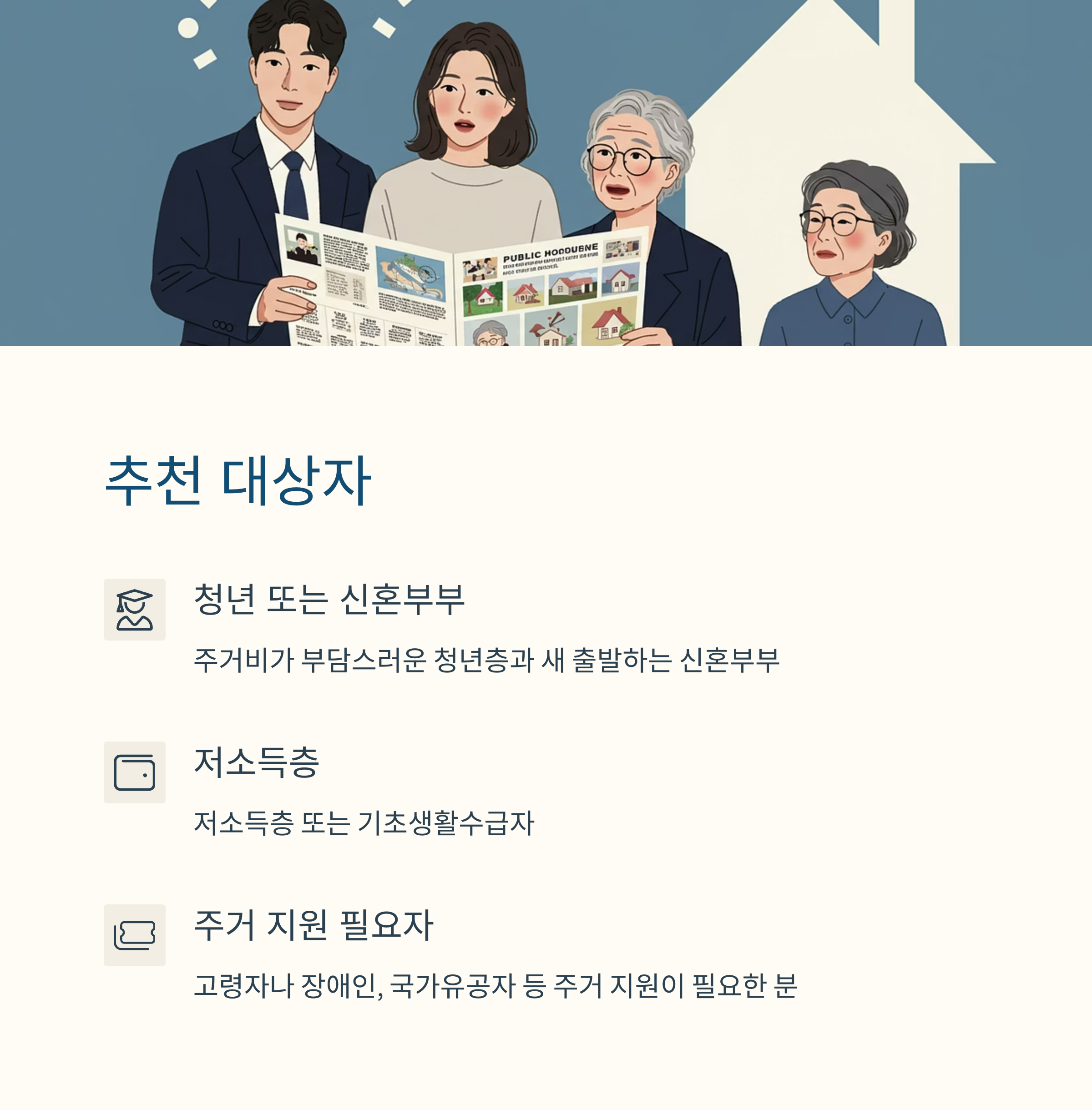 | 영구임대주택 | 생계·의료급여 수급자 등 최저소득층 | 50㎡ 이하 | 50년 이상 임대, 임대료 매우 저렴 |