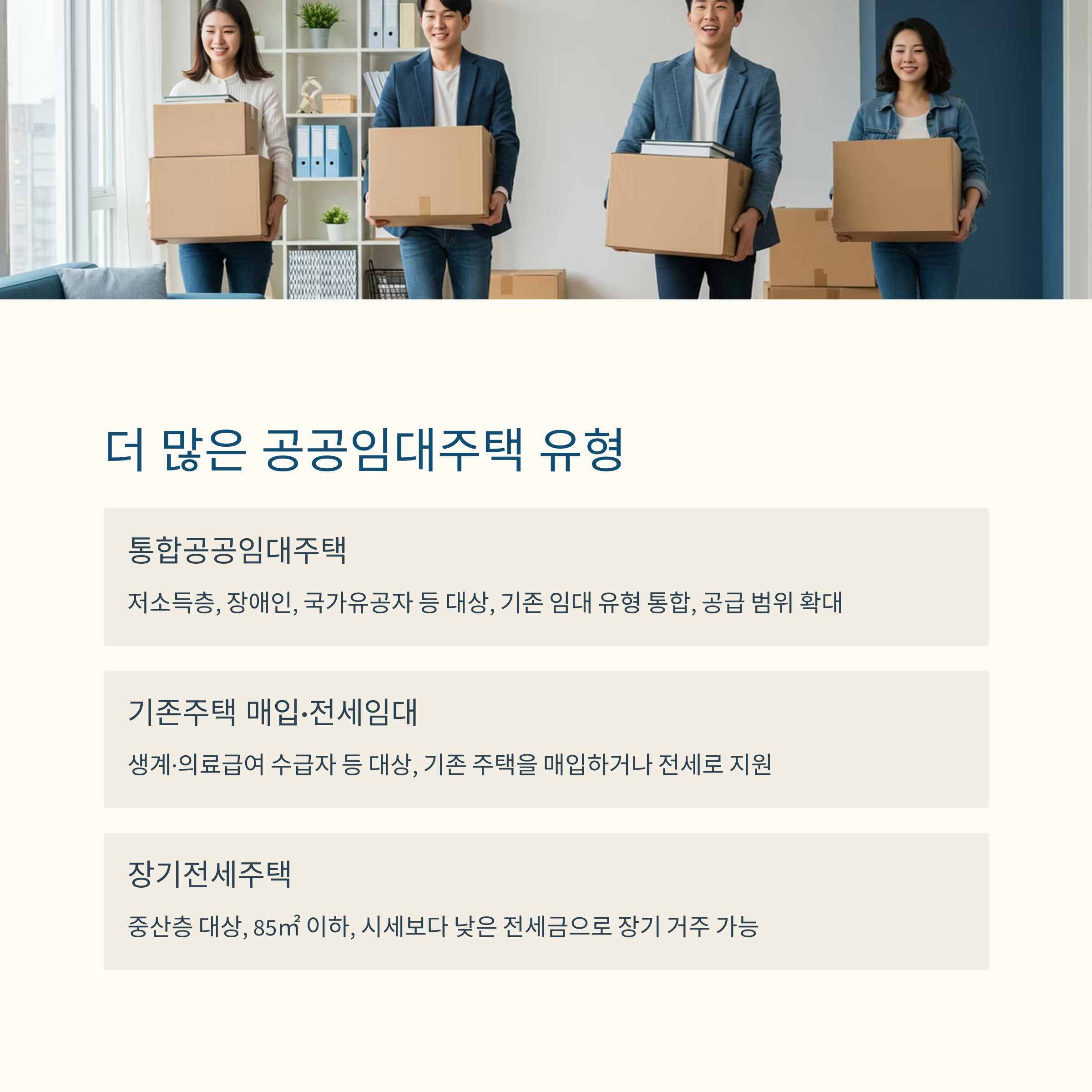 | 통합공공임대주택 | 저소득층, 장애인, 국가유공자 등 | 다양 | 기존 임대 유형 통합, 공급 범위 확대 |