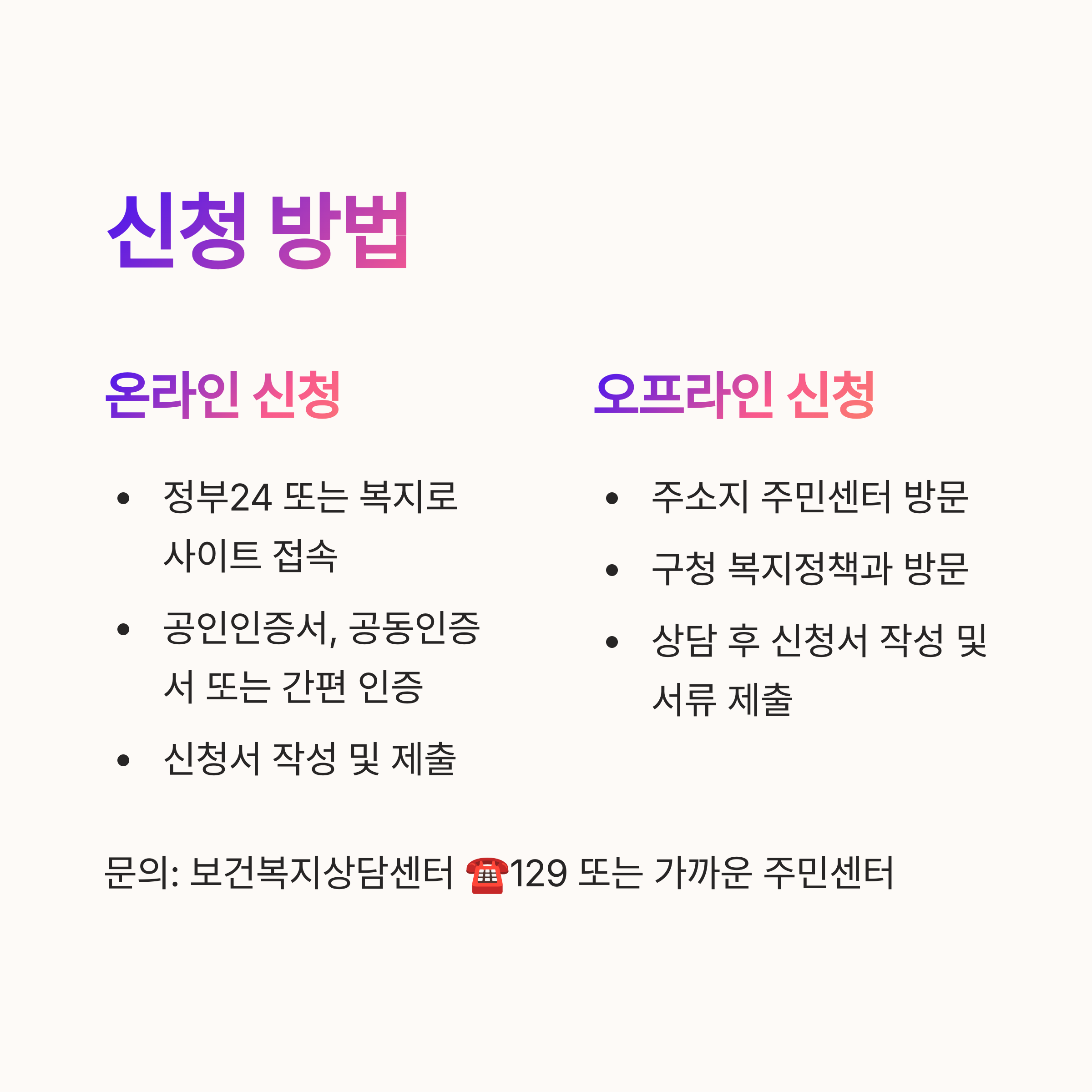 - 온라인 신청 가능: 정부24, 복지로 사이트