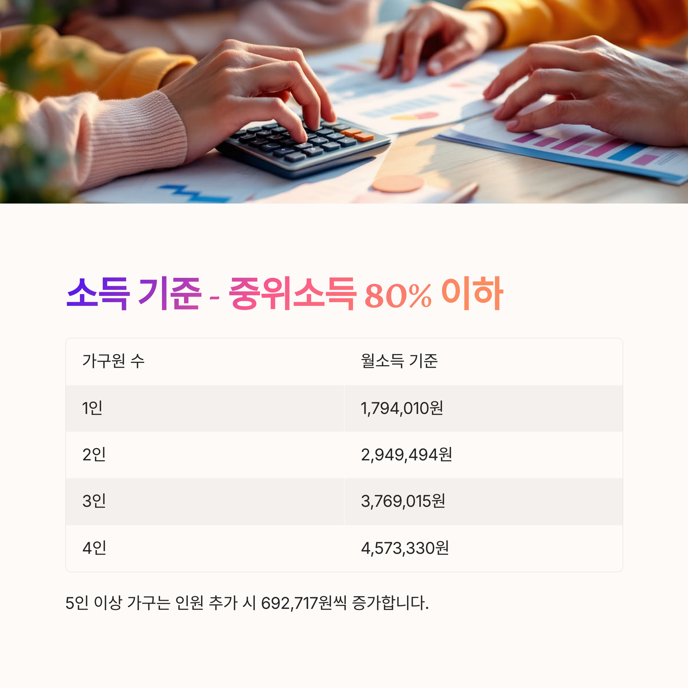 | 가구원 수 | 기준 중위소득 80% 이하 (월소득 기준) |