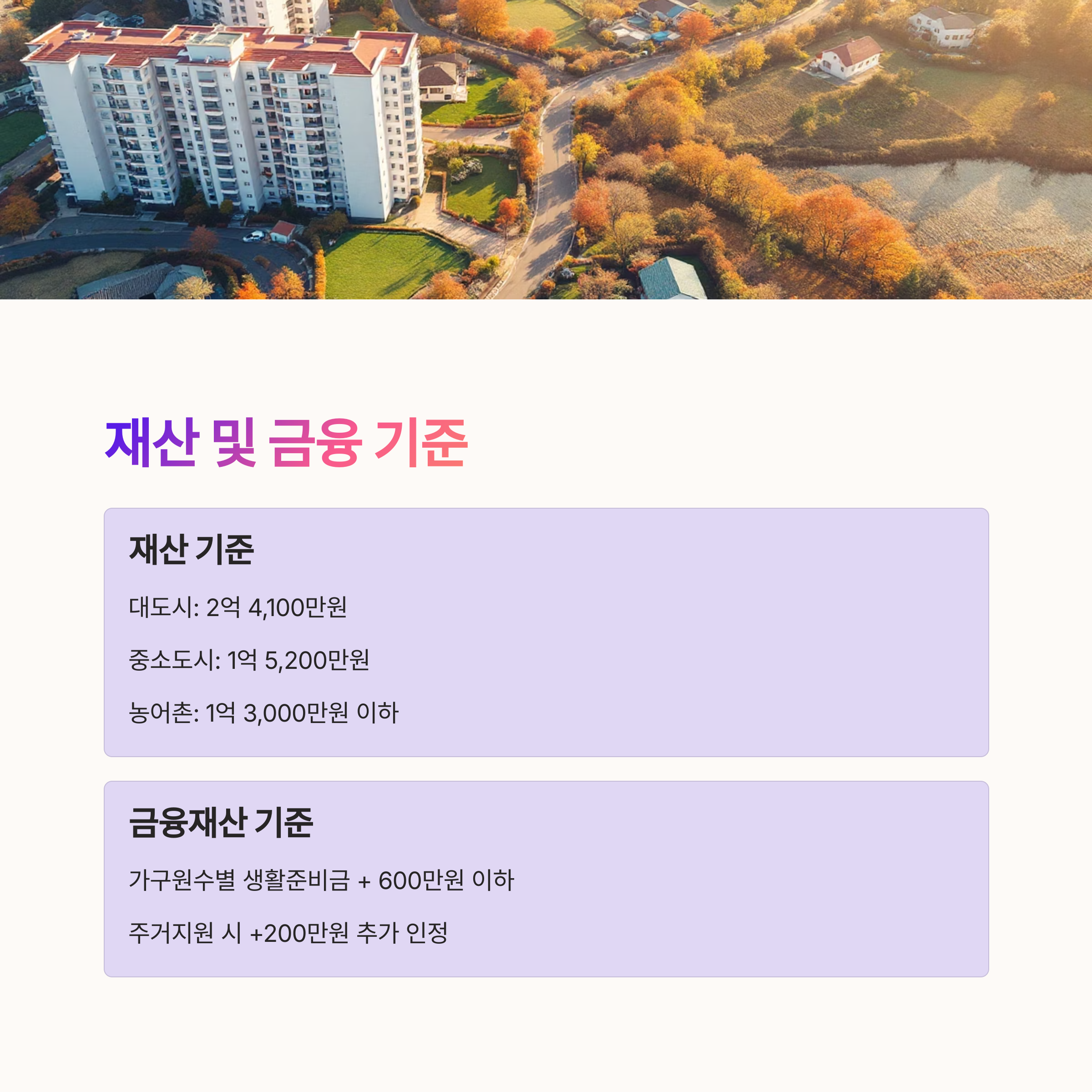 - 재산: 대도시 2억 4,100만 원, 중소도시 1억 5,200만 원, 농어촌 1억 3,000만 원 이하