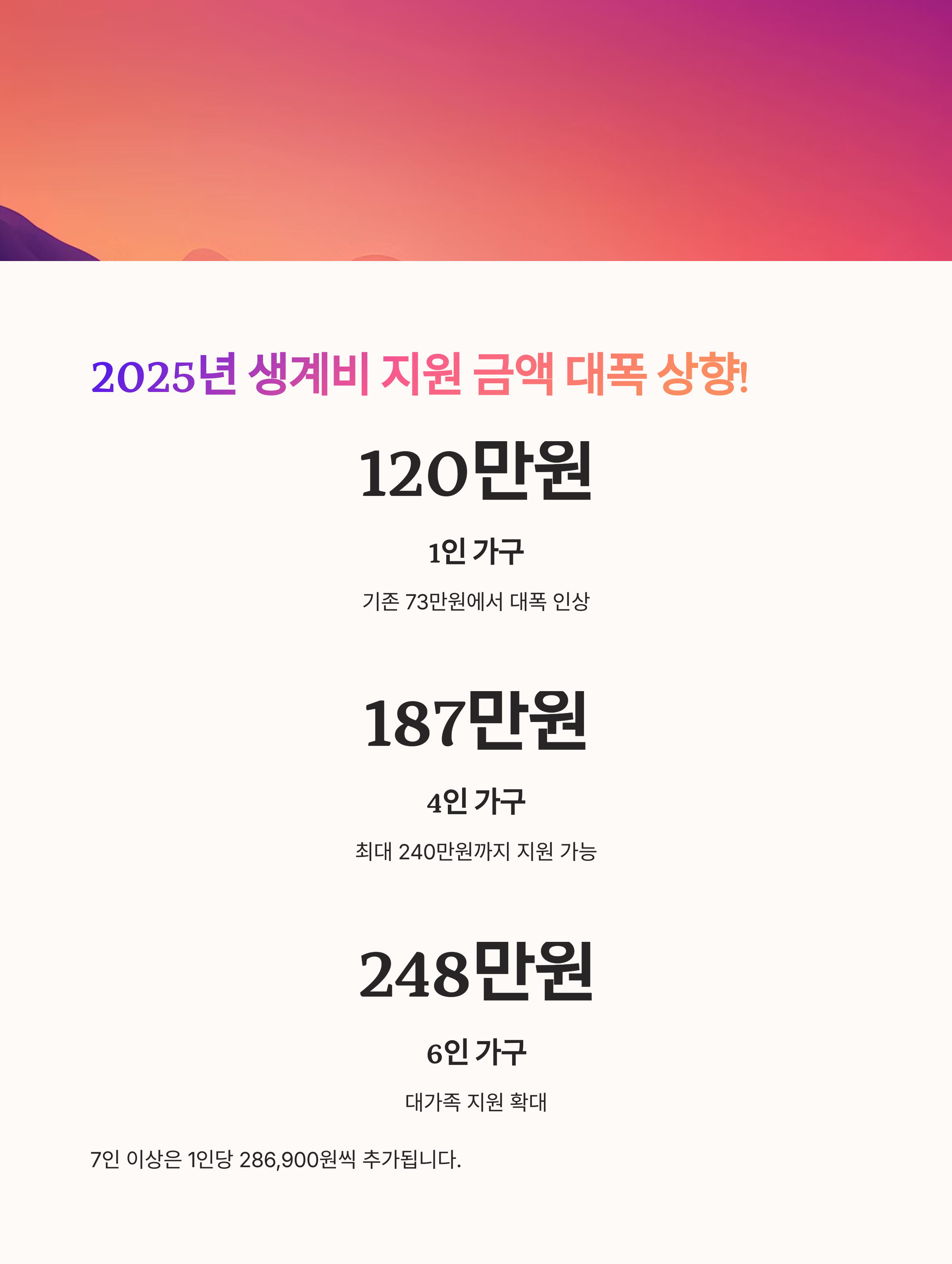 - 1인 가구: 73만 → 120만 원, 4인 가구: 최대 240만 원 지원