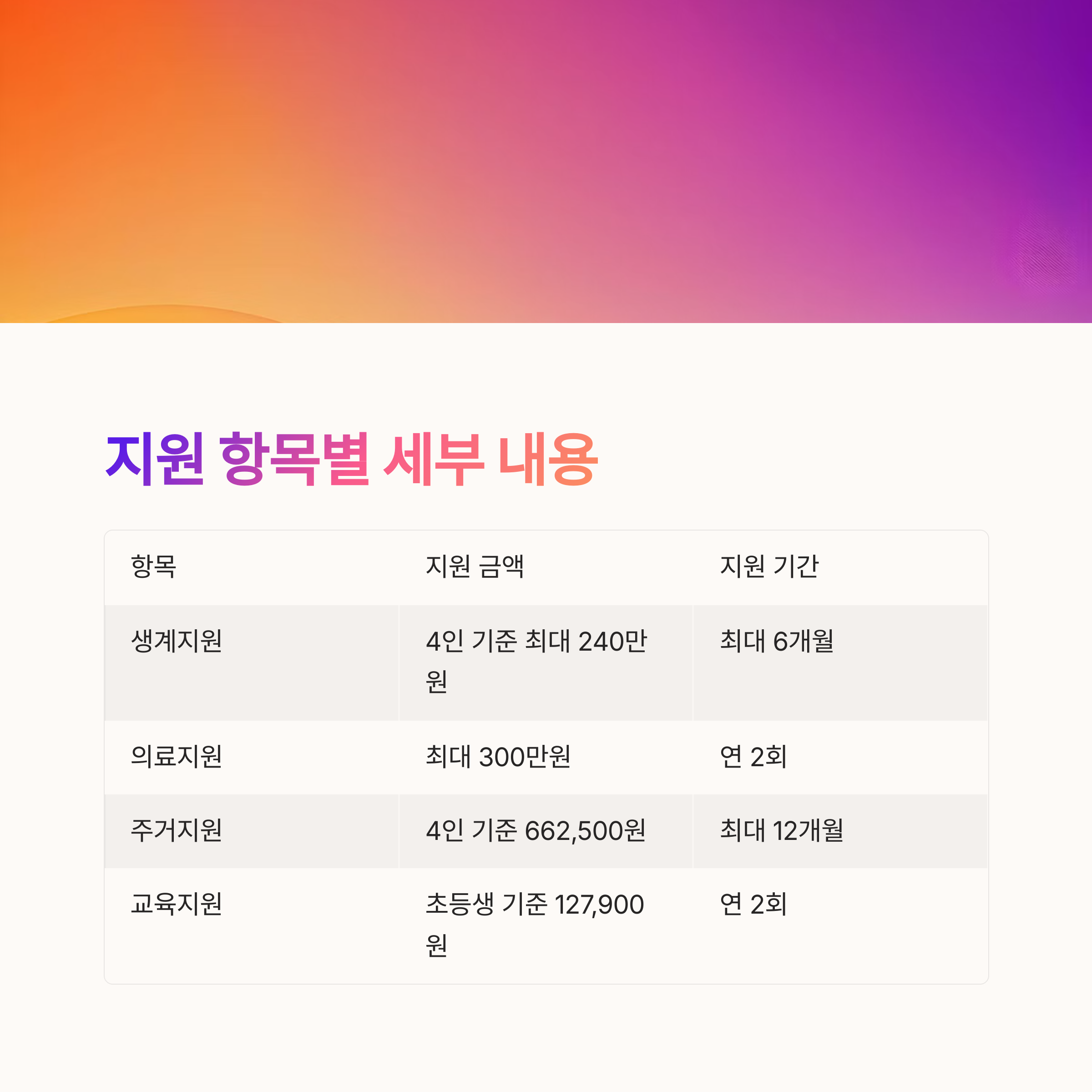 | 생계지원 | 식료품, 의복 등 생계 유지비 | 4인 기준 최대 240만 원 | 최대 6개월 |
