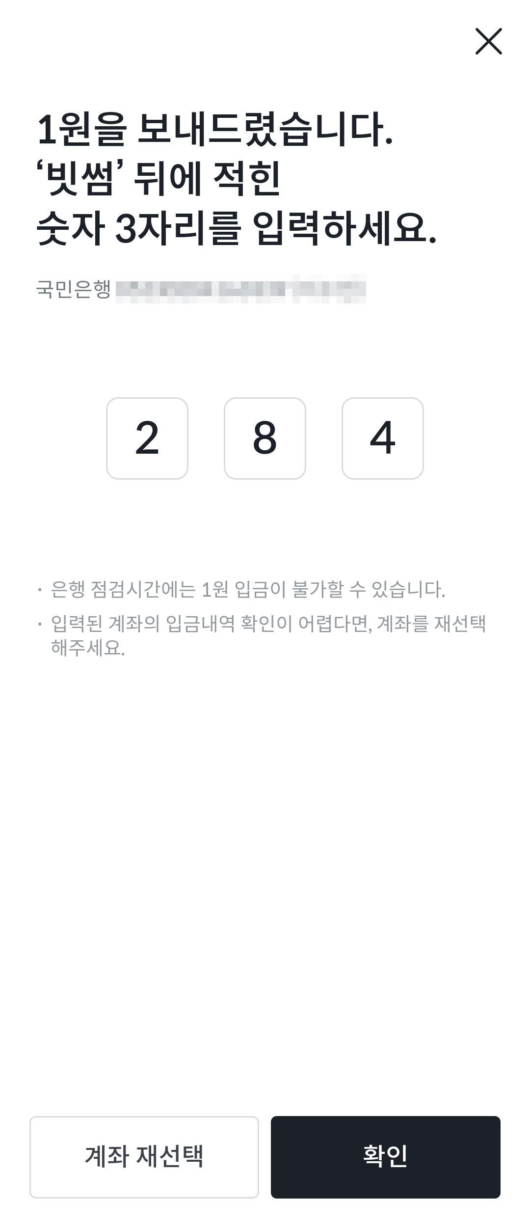 그리고 본인이 현재 가지고 있는 계좌(추후 연결할 계좌와 달라도 됨) 번호를 입력합니다. 본인 확인 인증용이기 때문에 빗썸과 연결할 NH 농협은행 계좌일 필요는 없고, 아무 계좌나 입력해서 1원 인증을 진행하세요. 본인 계좌에 입금된 1원 금액 적요에 기재된 '빗썸 ㅇㅇㅇ'의 ㅇㅇㅇ에 들어가는 세자리를 입력하면 됩니다. 저는 '빗썸 284'라고 입금되어, 아래처럼 284를 입력했습니다.