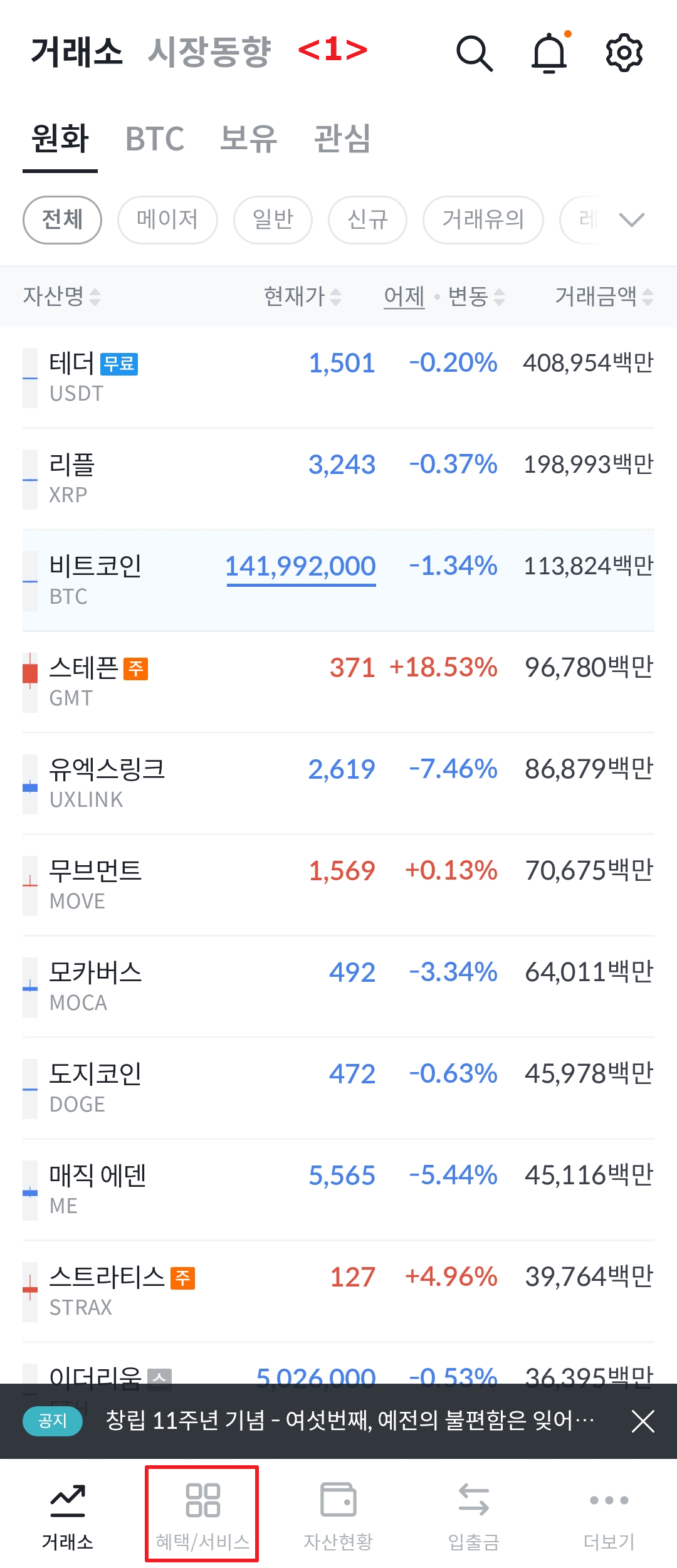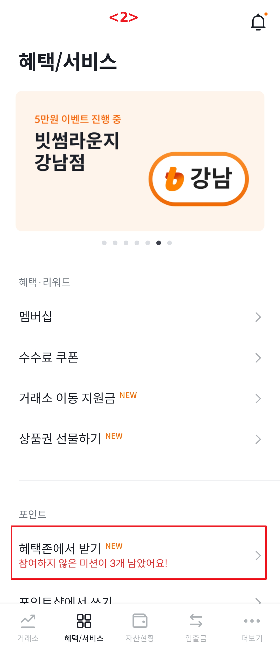 <1> 하단 혜택/서비스를 누르세요.