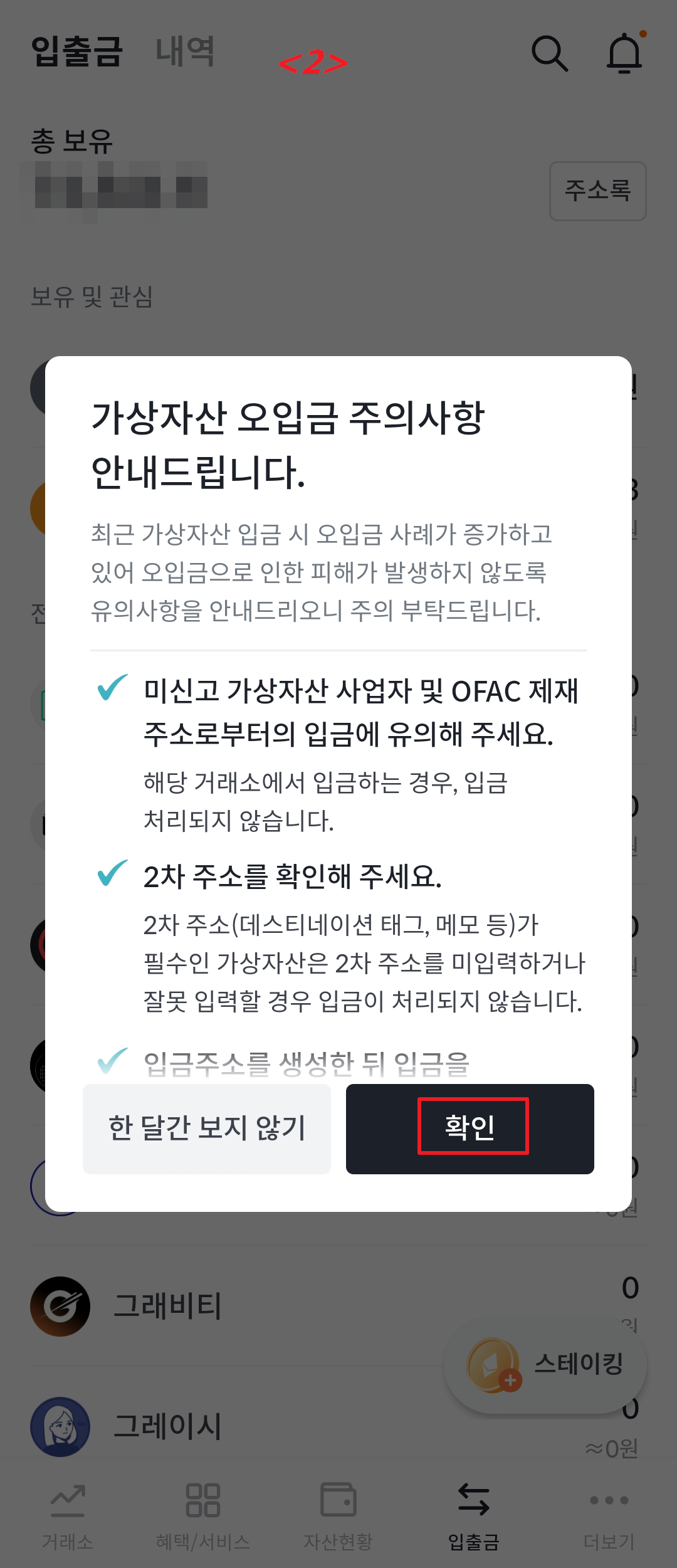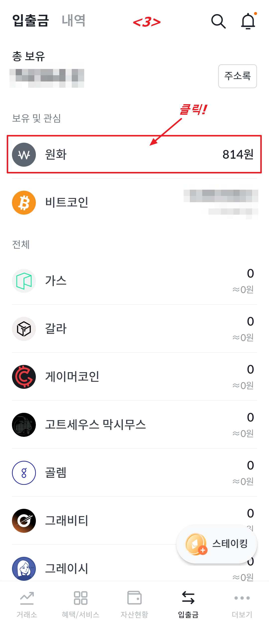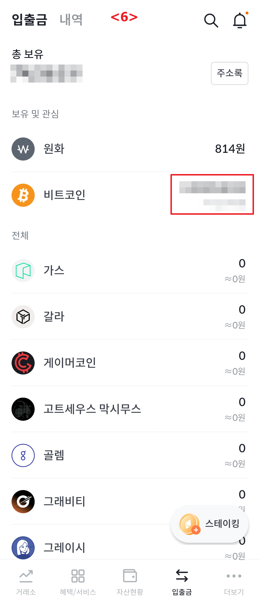 <6> "입출금"에서 비트코인 금액이 확인되면 내 빗썸 가상 지갑으로 비트코인 구매가 완료된 것입니다.