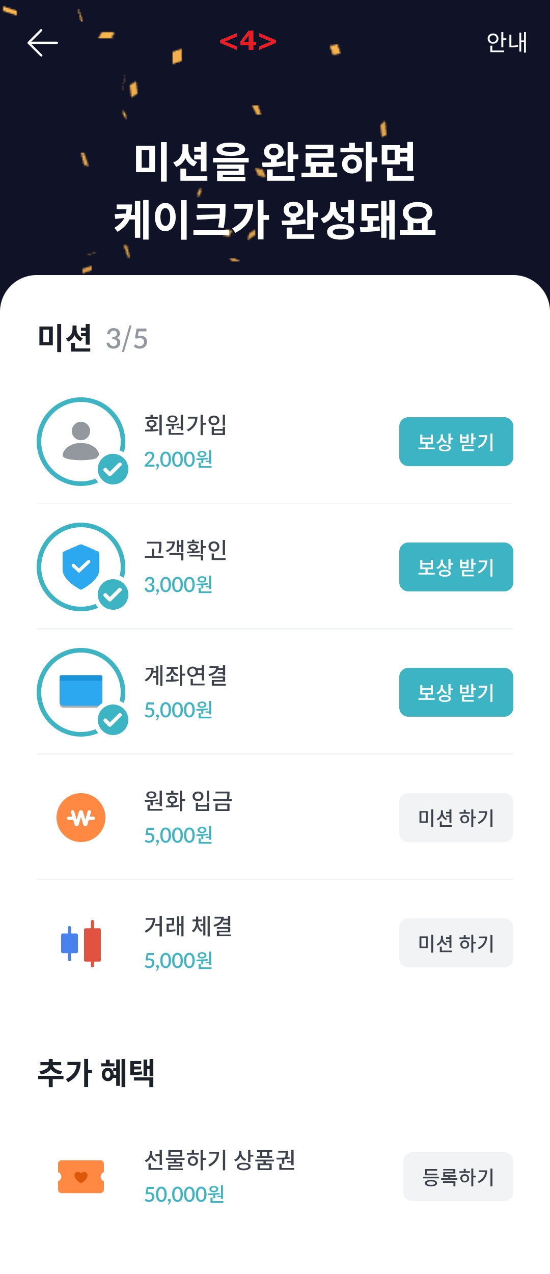 회원가입, 고객확인, 계좌연결, 원화입금, 거래 체결의 총 5개의 웰컴 미션이 완료되었습니다.
