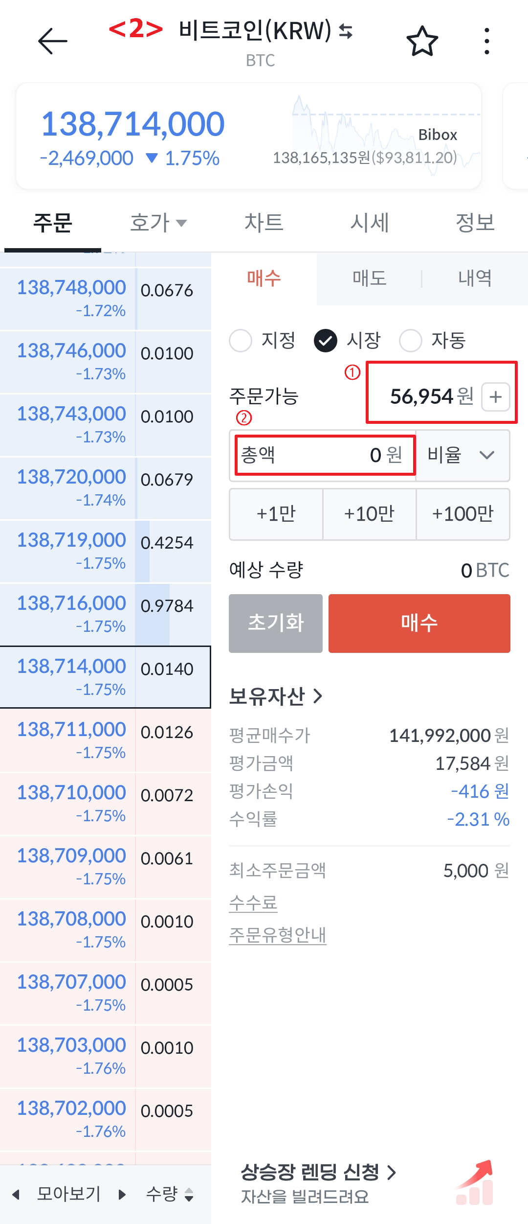 <2> 시장가에 매수를 하려면 시장을 체크하고, ① 주문가능 금액을 확인하고 ② 총액을 누릅합니다.