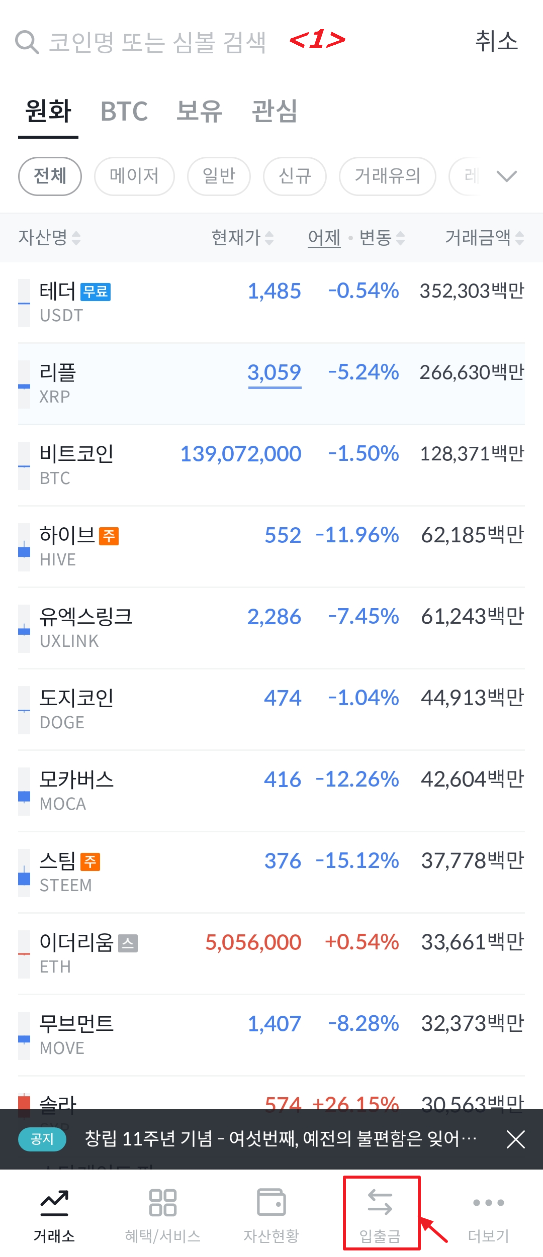 <1> 빗썸 앱을 실행하고, 우측 하단에 입출금을 누릅니다.