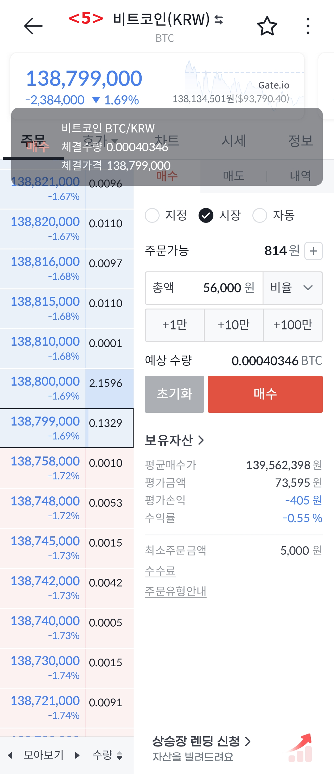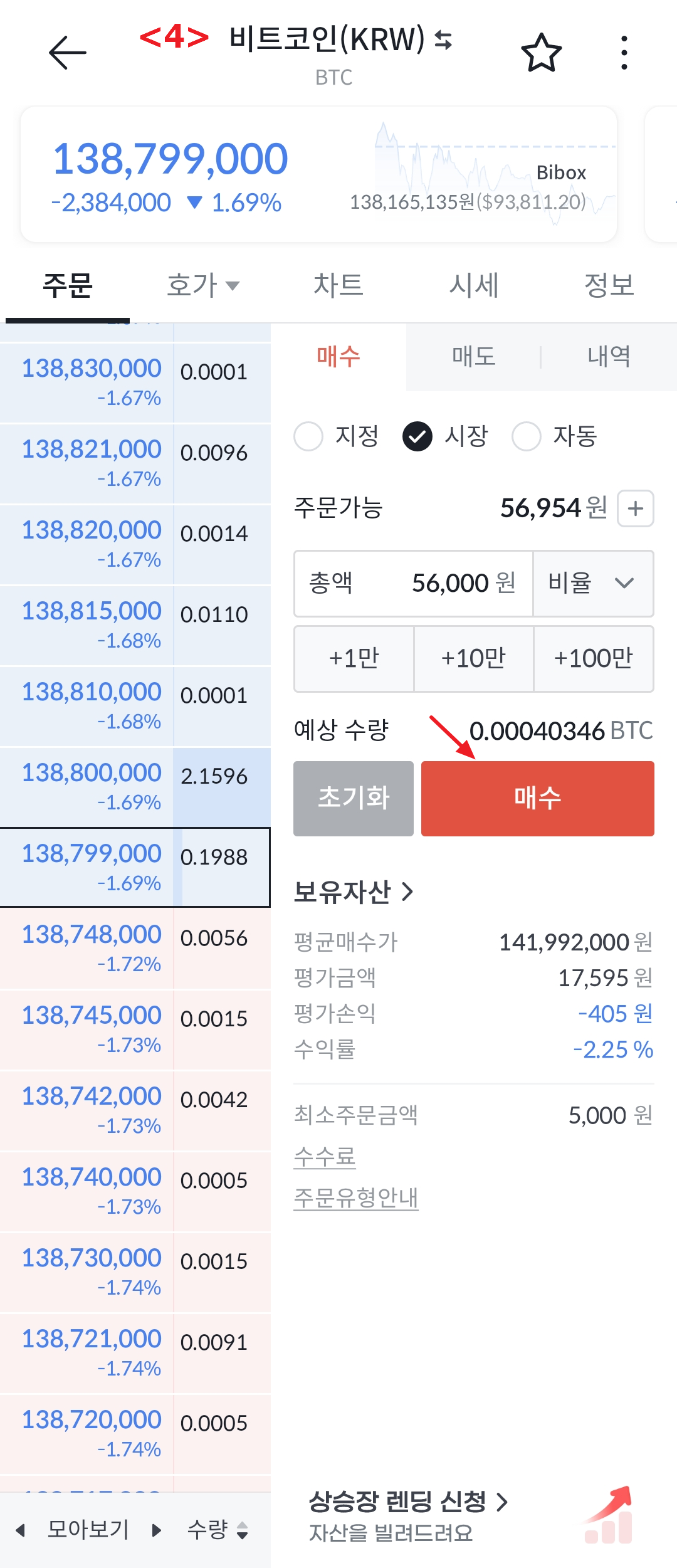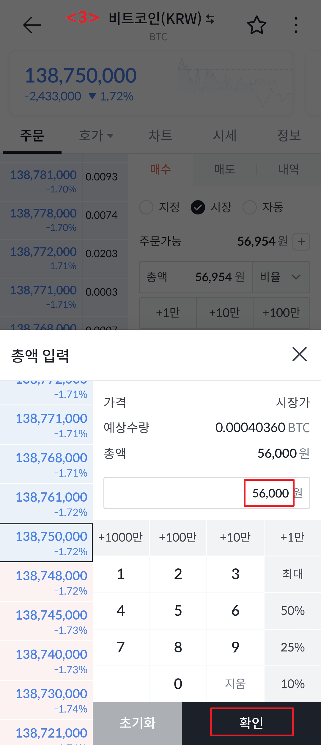 ※ 아래 예에서는 주문가능 금액이 56,954원 이므로, 그 한도내의 56,000원으로 시장가로 구매했을 때 0.00040360 BTC를 사는 것입니다.