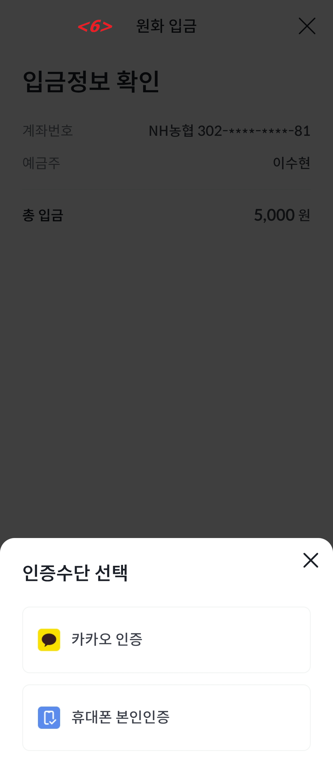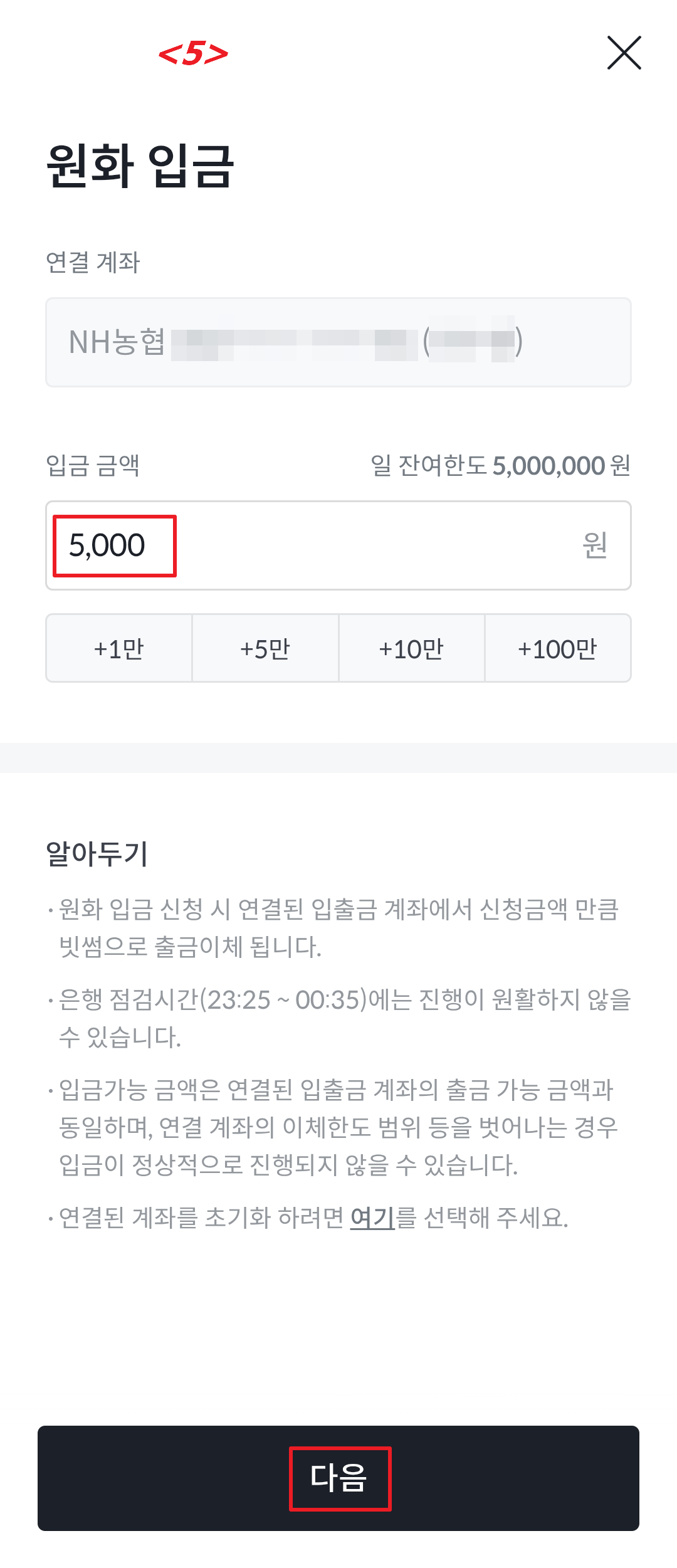 <5> 연결된 NH농협은행 계좌에서 입금할 5,000원을 입력합니다.
