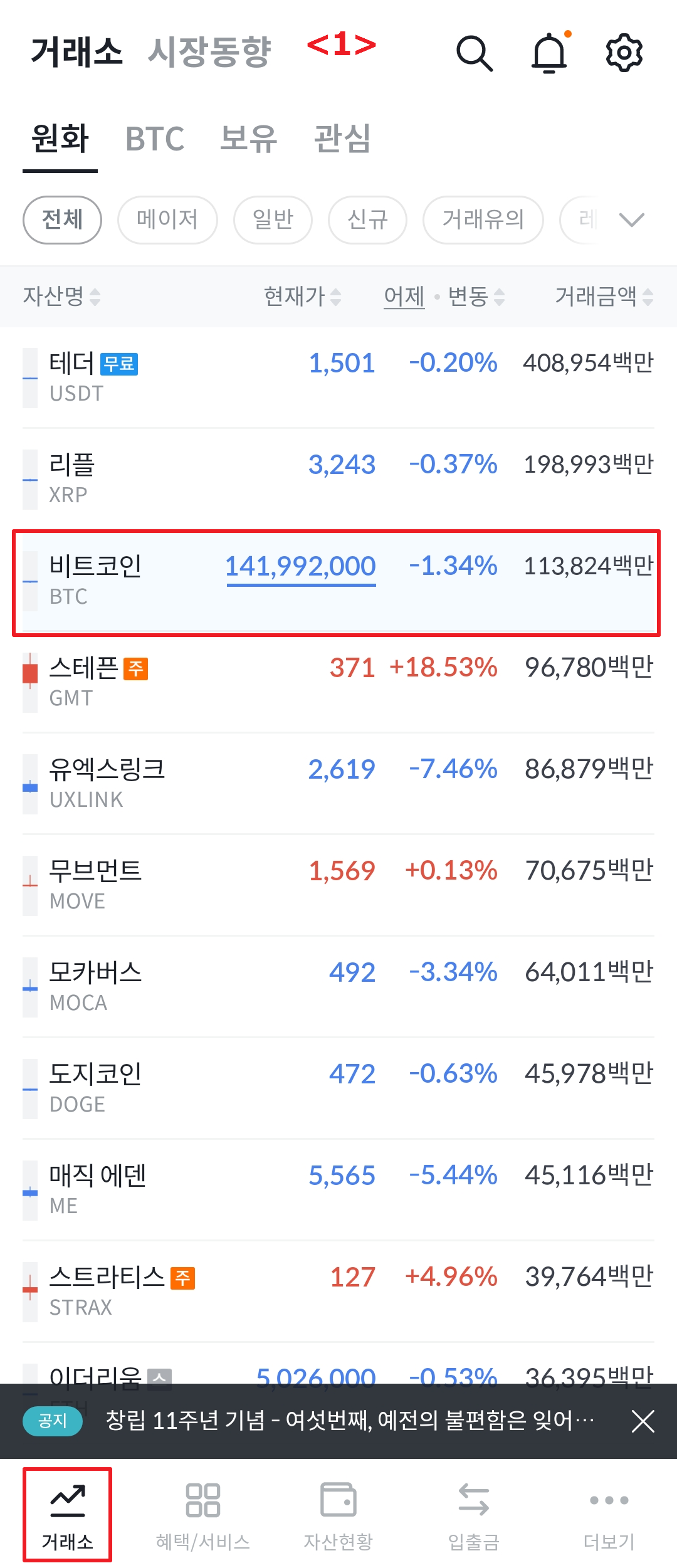 <1> 좌측 하단에 거래소에서 들어온 상태에서, 비트코인을 선택합니다. (다른 코인을 원하시면 선택하셔서 거래해도 과정은 동일합니다.)