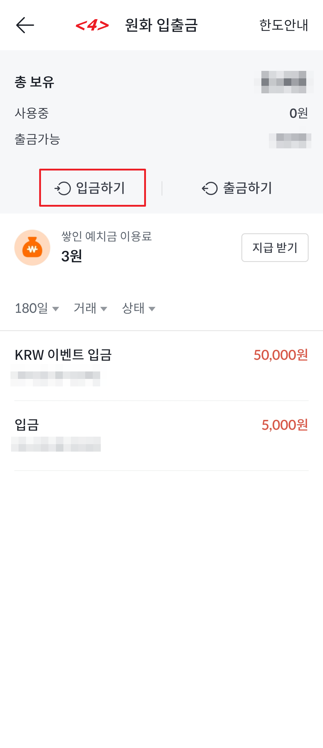 <4> 입금하기를 누릅니다. 참고로, 아직 이벤트 참여 리워드가 지급되지 않았다면, 아래 내역엔 아무것도 없습니다.