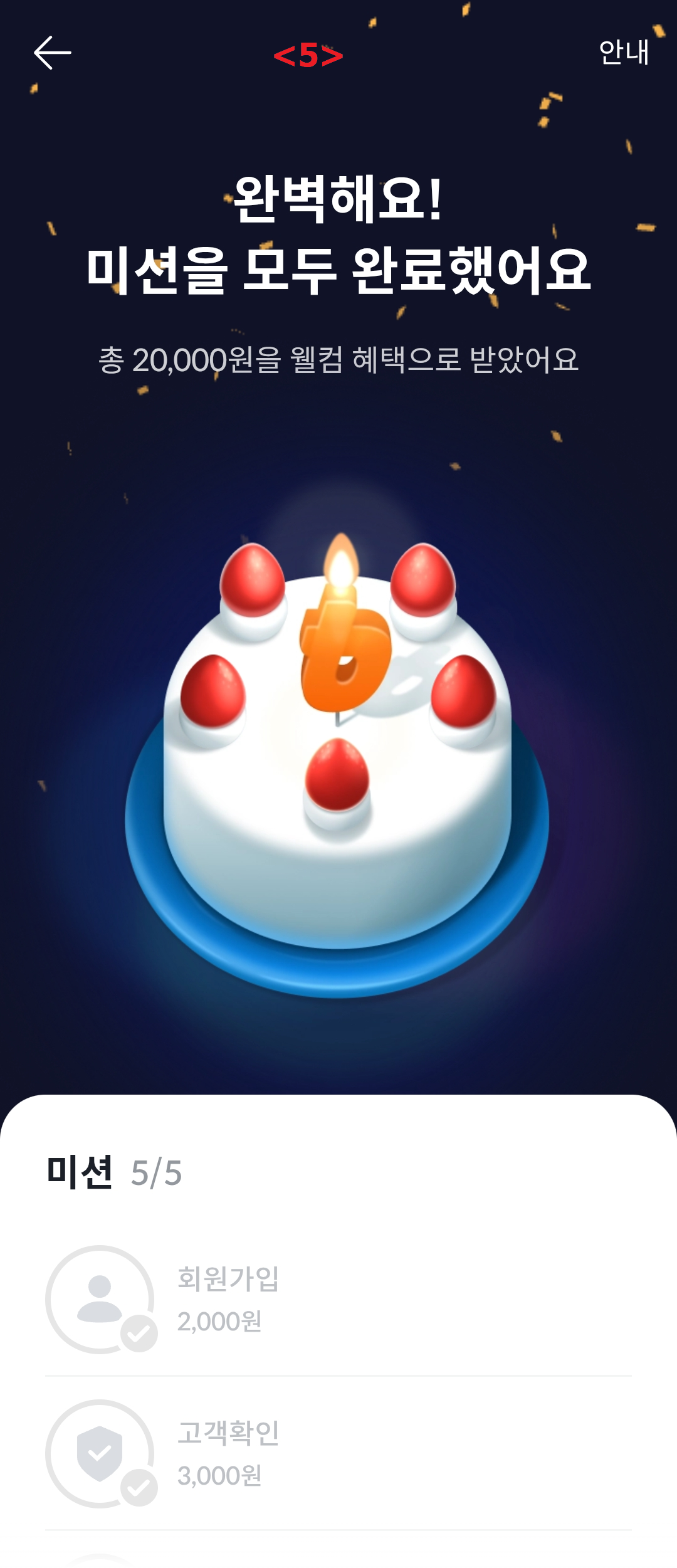 <4> 현재 미션이 완료된 상태이므로 5개 웰컴 미션에 대해 '보상 받기'를 모두 누르세요.