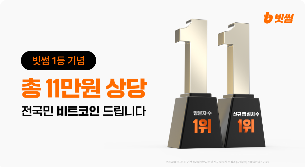작년 11월 기준, 빗썸 거래소가 월간 방문자 수, 사용자 수, 앱 신규 설치 수 부문에서 업종 점유율 1위를 달성했습니다. 이를 기념하여 신규 가입자를 위해 총 11만원을 혜택을 받을 수 있는 이벤트를 진행하고 있습니다.