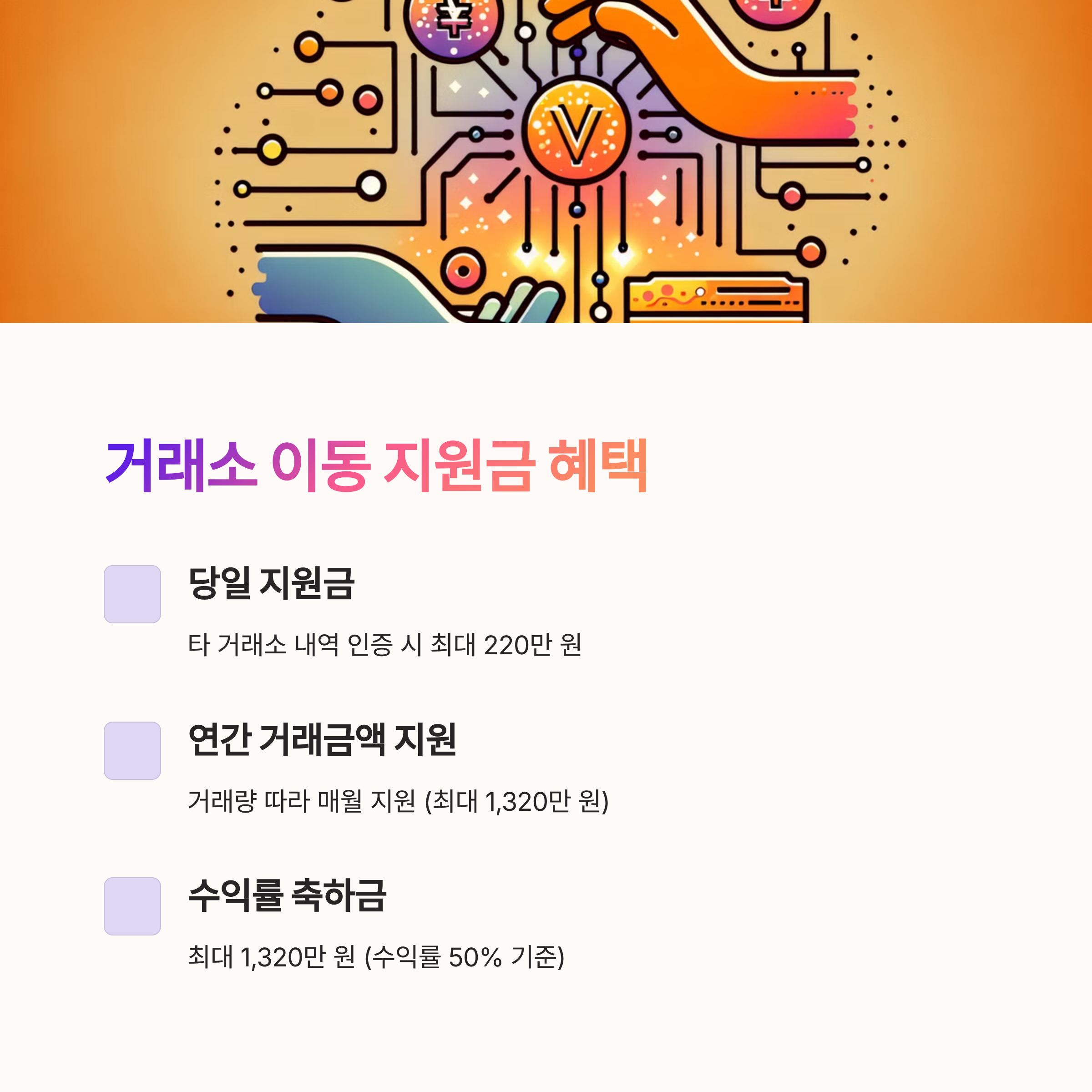 - 당일 지원금: 타 거래소 내역 인증 시 최대 220만 원