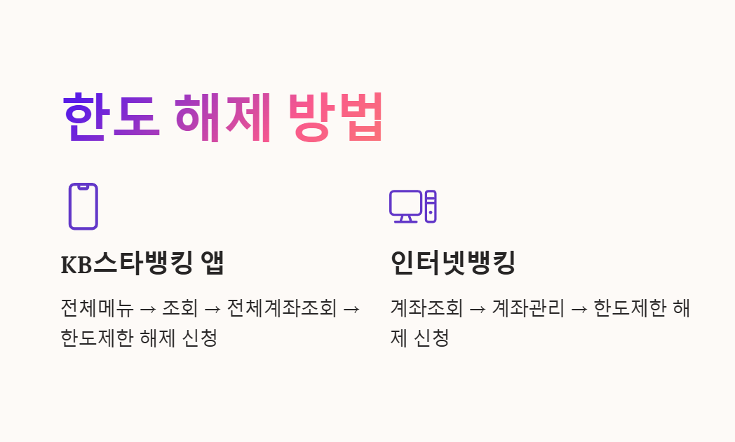 - KB스타뱅킹 앱 → [전체메뉴] → [조회] → [전체계좌조회] → [한도제한 해제 신청]