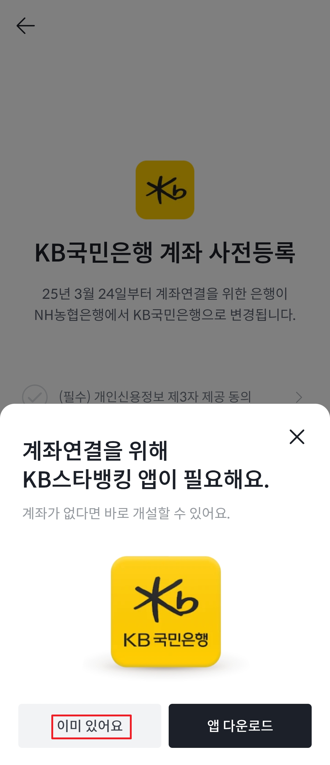 빗썸 앱에 접속하면 뜨는 사전등록 배너를 누릅니다.('계좌 사전등록') KB국민은행 계좌와 앱이 있으신 분들은 아래처럼 계속 진행하세요. "이미 있어요"를 누른후, "동의 후 사전등록하기"를 누르면, KBstar 앱으로 이동합니다.