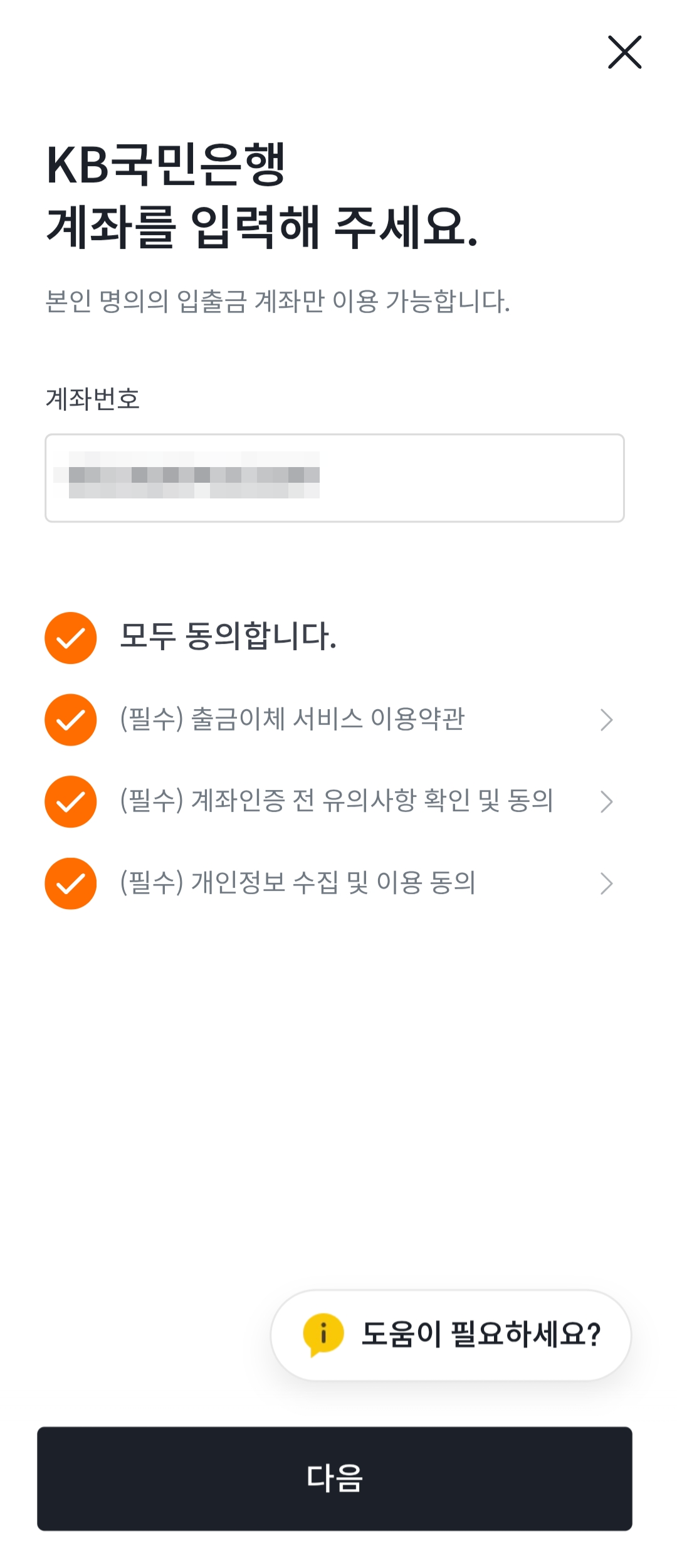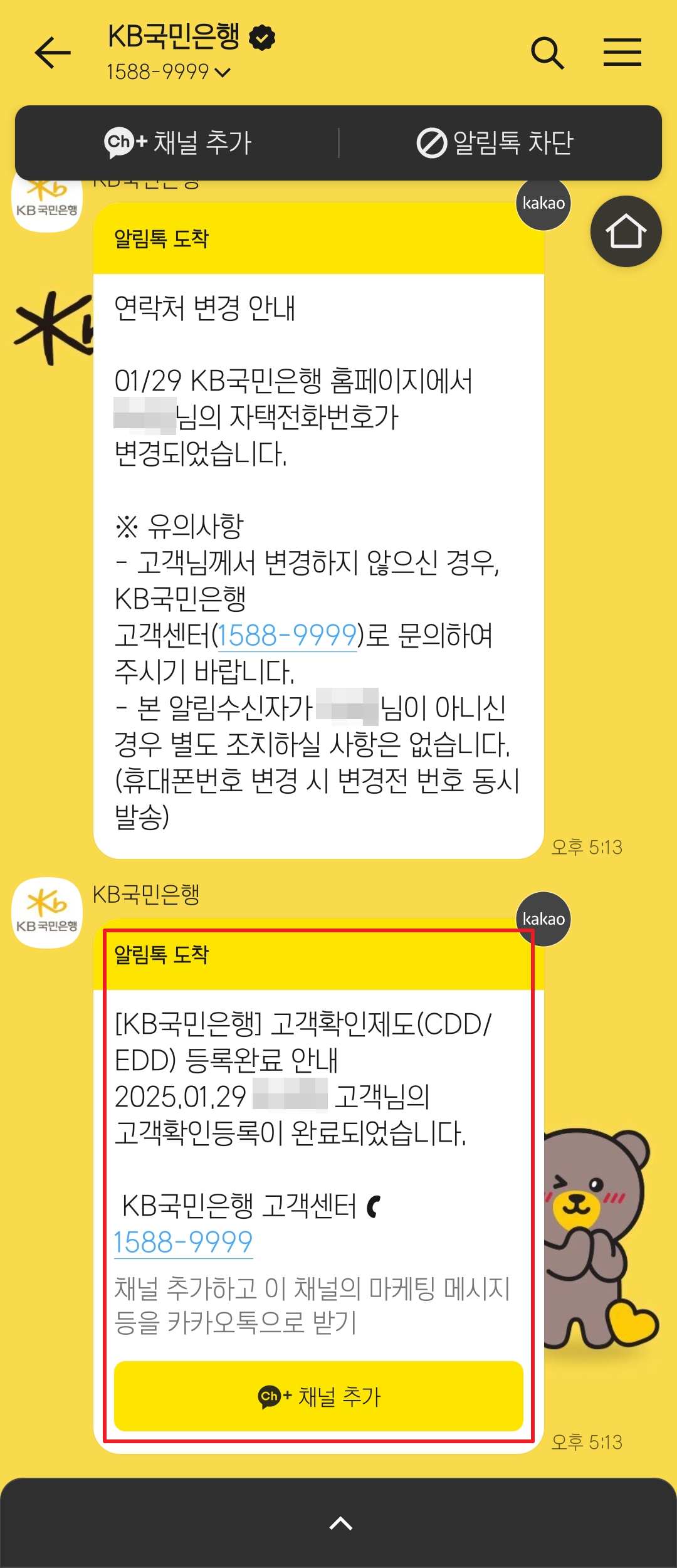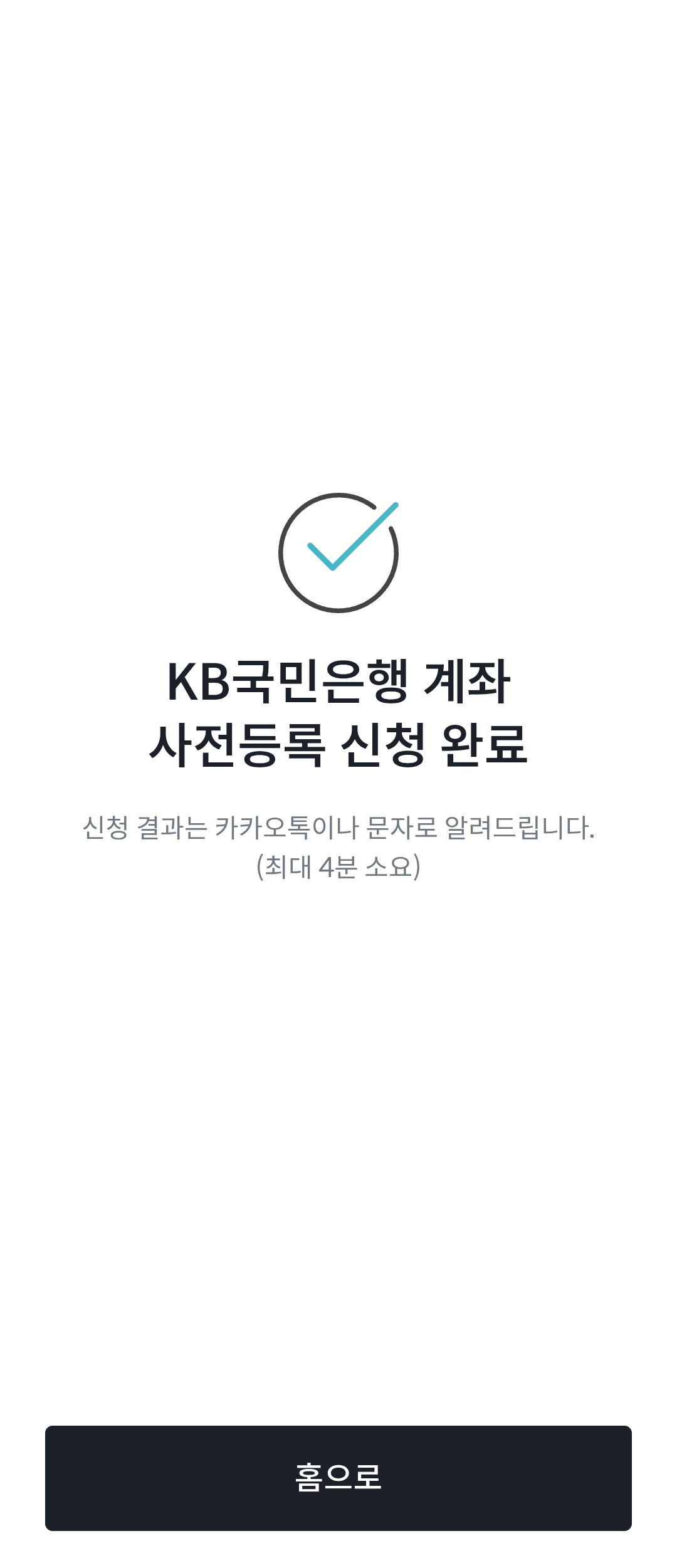 계좌번호와 비밀번호를 입력하여 고객확인을 완료합니다. 국민은행에서 알림톡이 오면 고객확인이 완료된 것입니다.