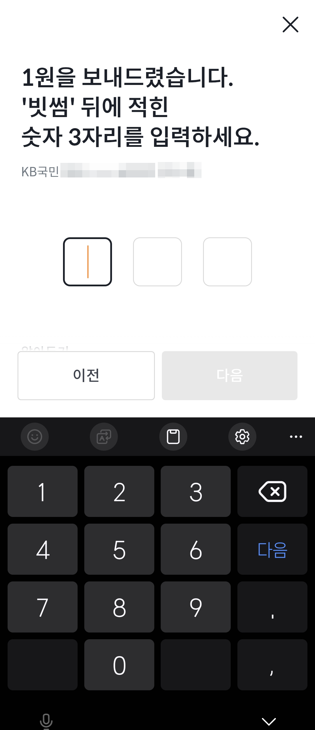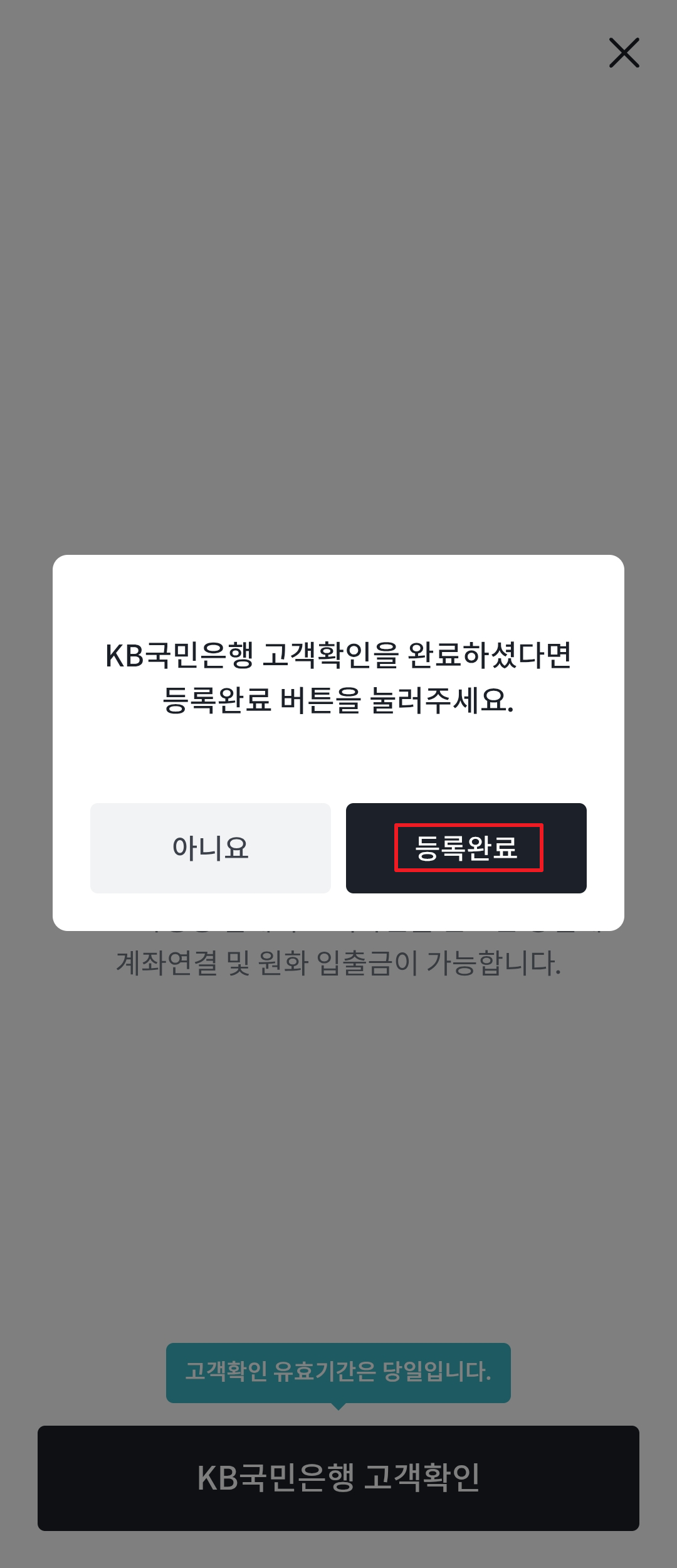 빗썸 앱으로 돌아와서 "등록완료"를 누릅니다. KB국민은행 계좌를 입력하고 1원 인증을 진행합니다.