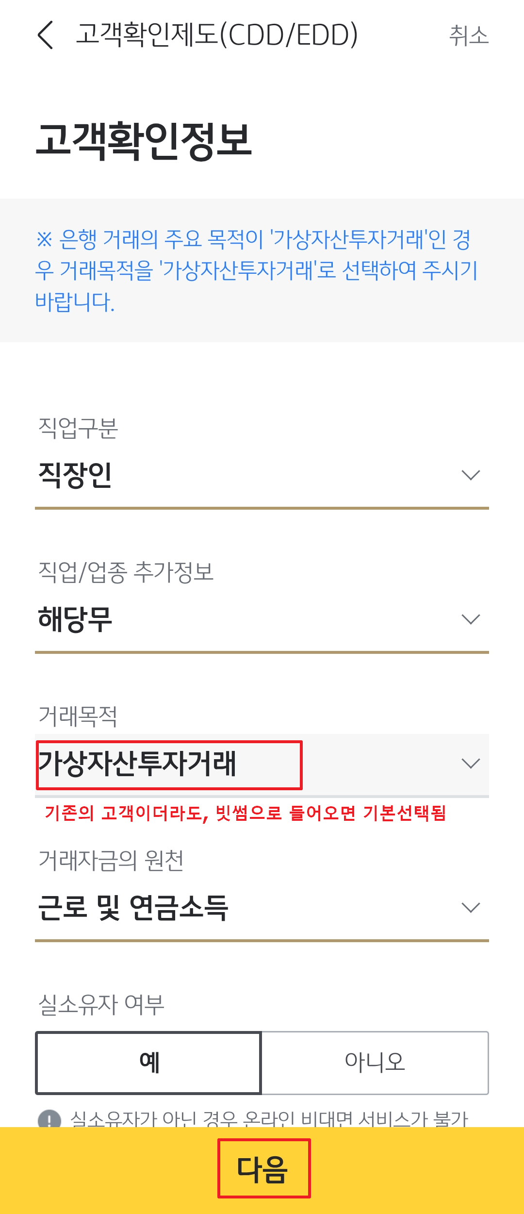 휴대폰 본인인증과 개인 정보를 확인합니다. 거래목적은 기존의 국민은행 고객이더라도 빗썸을 통해 접근했다면 "가상자산투자거래"에서 변경할 수 없습니다. 그대로 진행하면 됩니다.