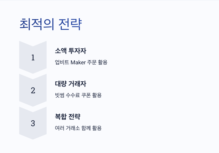 - 업비트: 기본 수수료는 0.139%지만, 예약 주문(Maker) 시 0.05%로 할인됩니다.