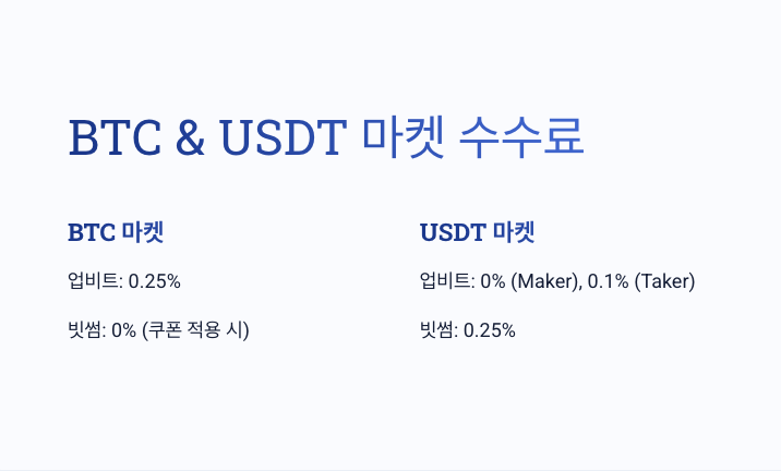 - BTC 마켓: 업비트와 빗썸 모두 기본적으로 0.25%지만, 빗썸은 쿠폰을 활용하면 수수료가 무료