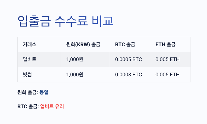 | 거래소 | 원화(KRW) 출금 | 비트코인(BTC) 출금 | 이더리움(ETH) 출금 |