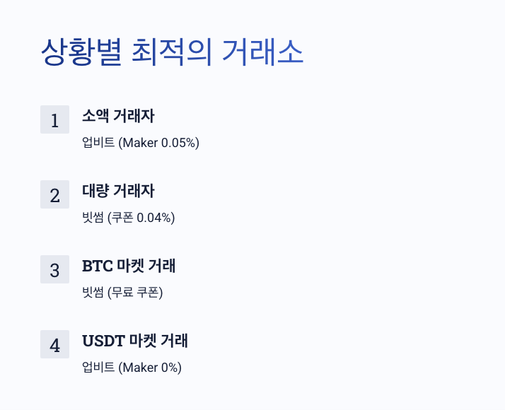 | 대량 거래 & 수수료 절감 | 빗썸 (쿠폰 활용 시 0.04%) |