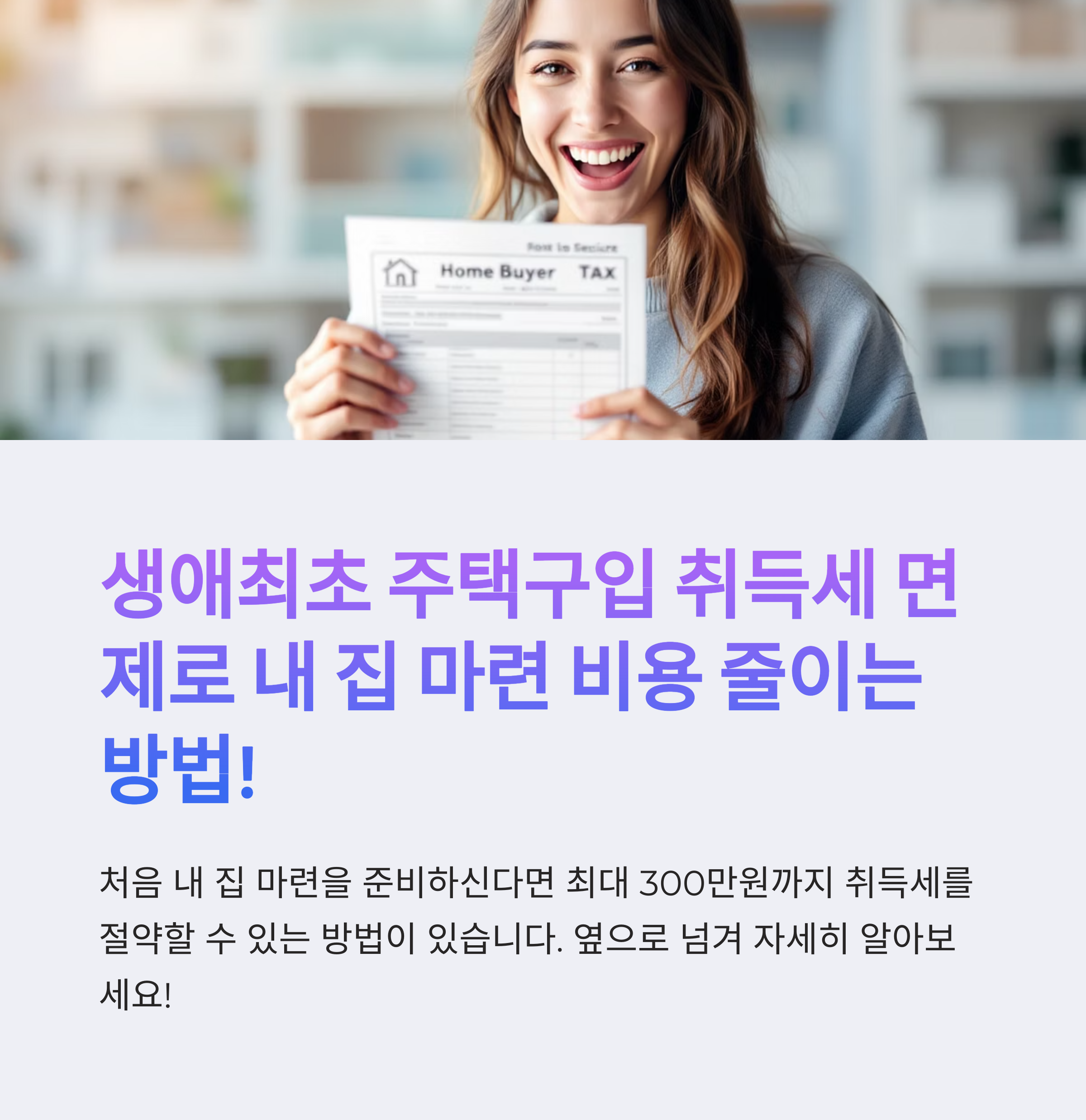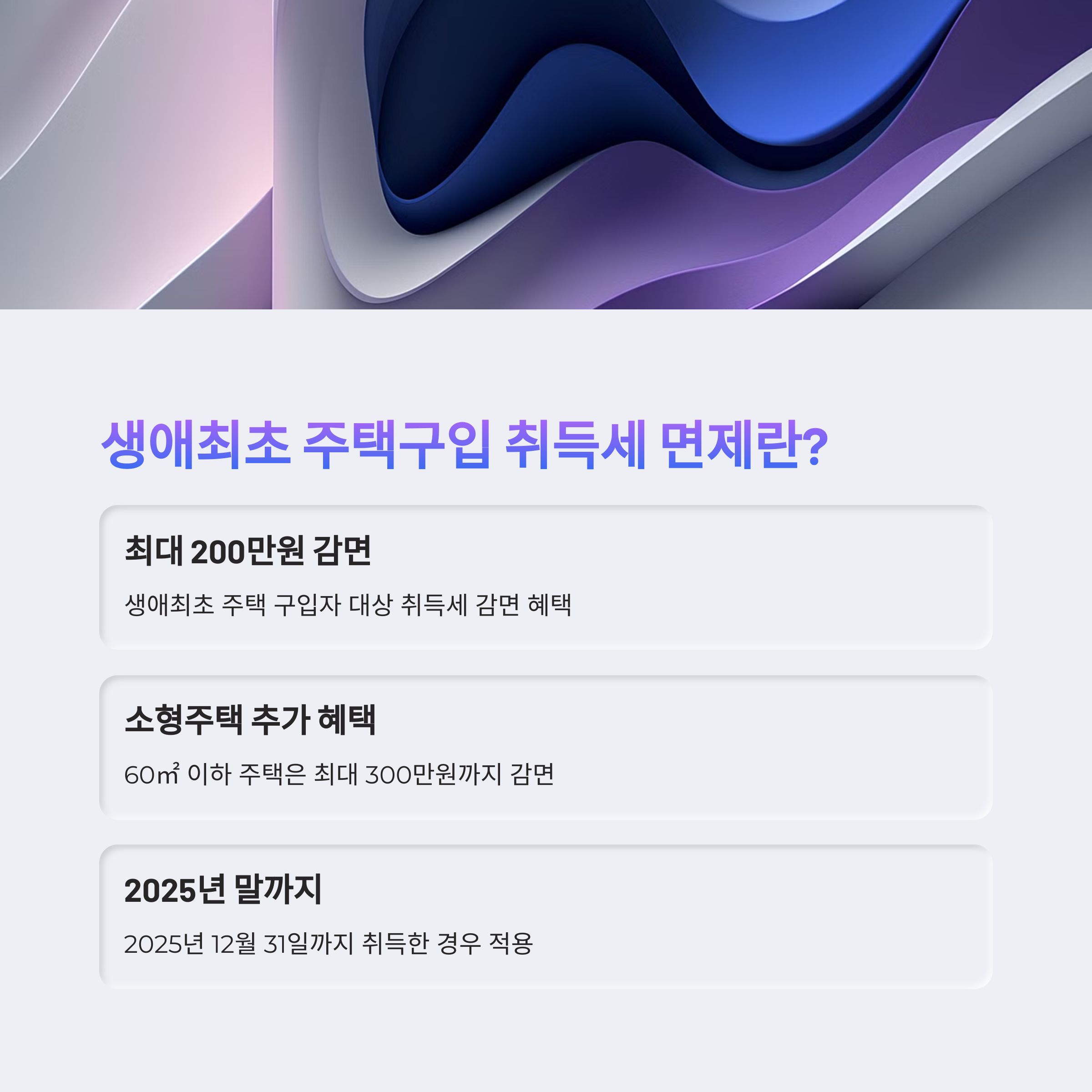 생애최초로 주택을 구입하는 무주택자를 대상으로 최대 200만 원(소형주택은 최대 300만 원)까지 취득세를 감면해주는 제도입니다. 특히 청년, 신혼부부, 주거 취약계층에게 실질적인 도움이 되고 있습니다.