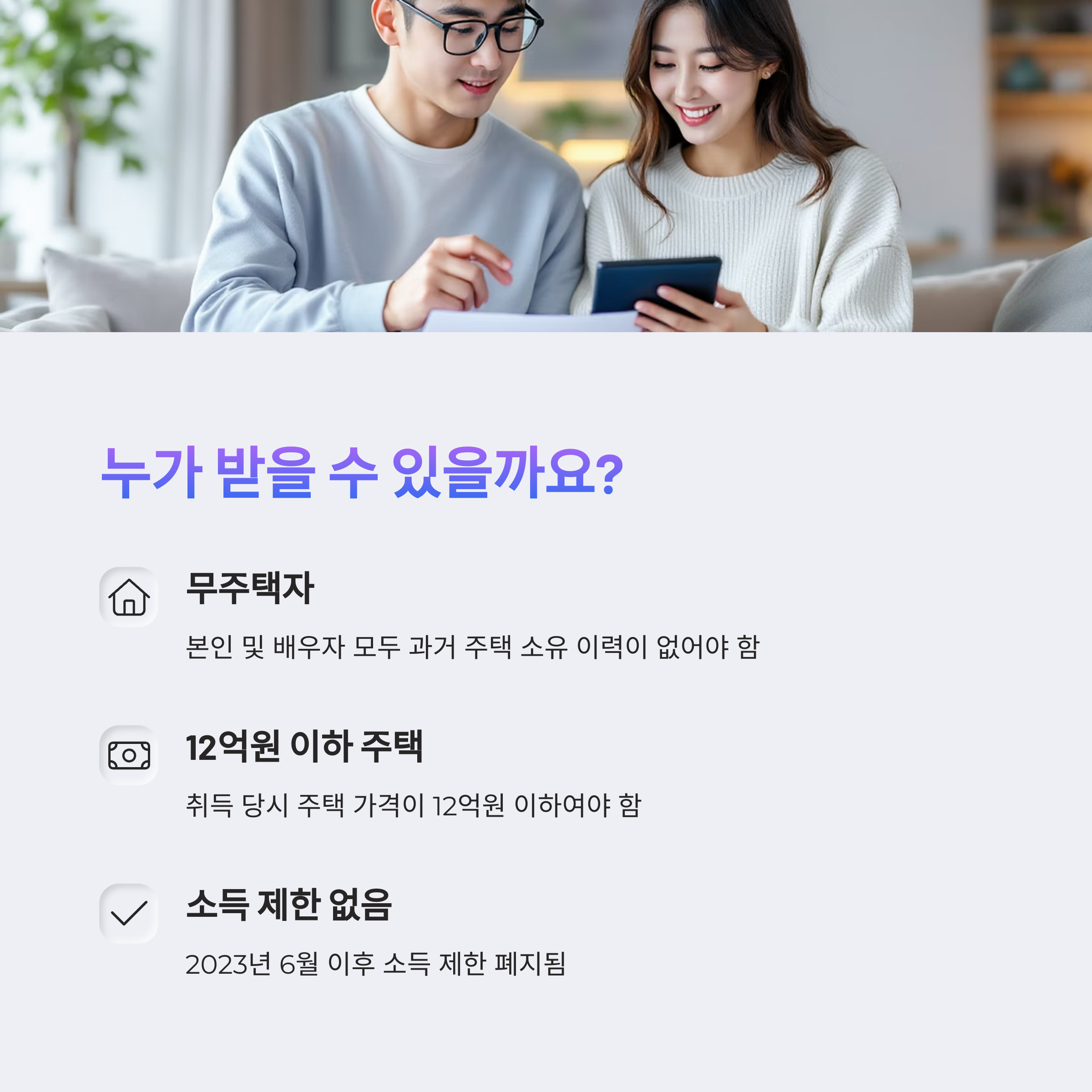 A1. 네 본인과 배우자가 모두 무주택자이고, 주택 가격이 12억 원 이하라면 누구나 가능합니다.