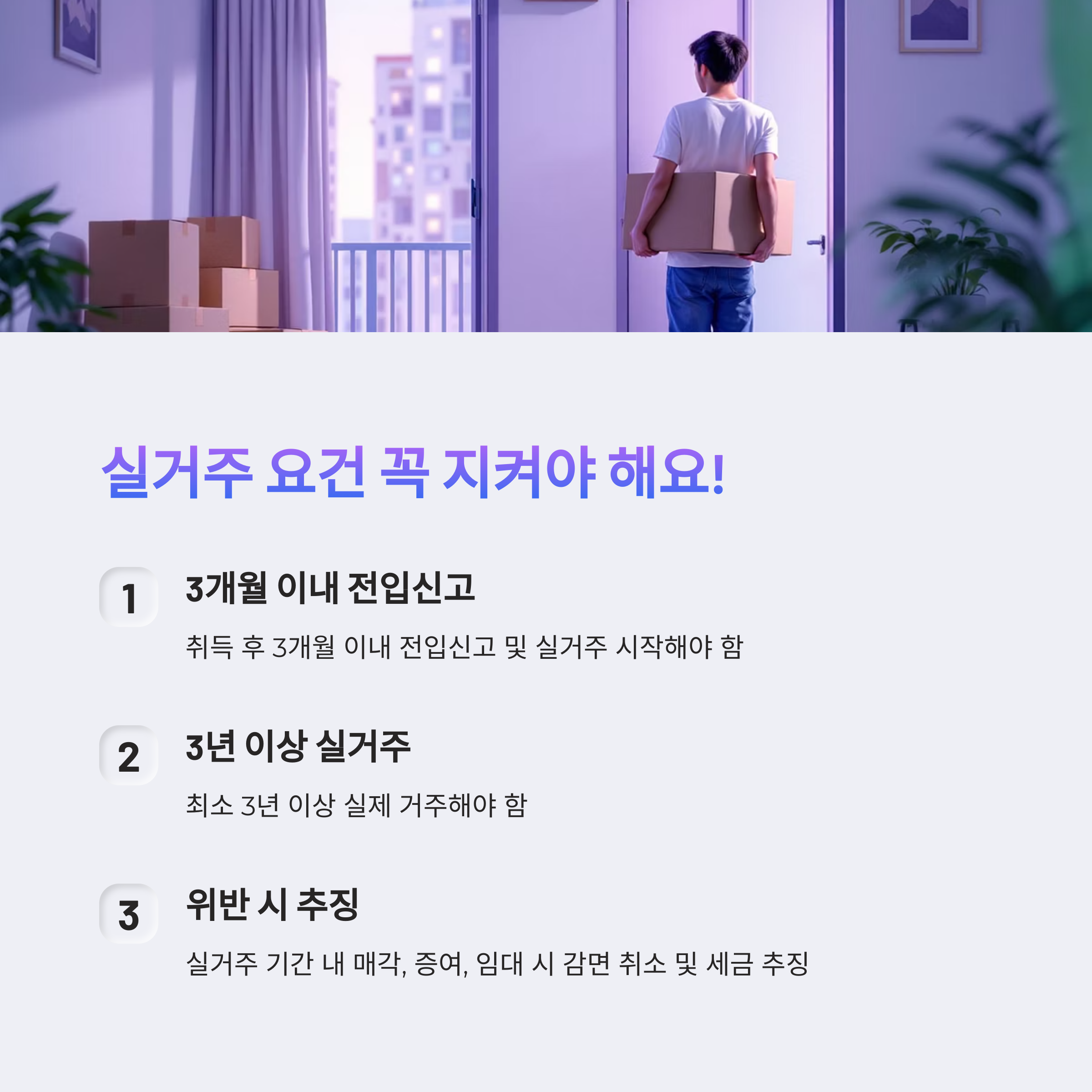 - 취득 후 3개월 이내 전입신고 + 실거주 시작