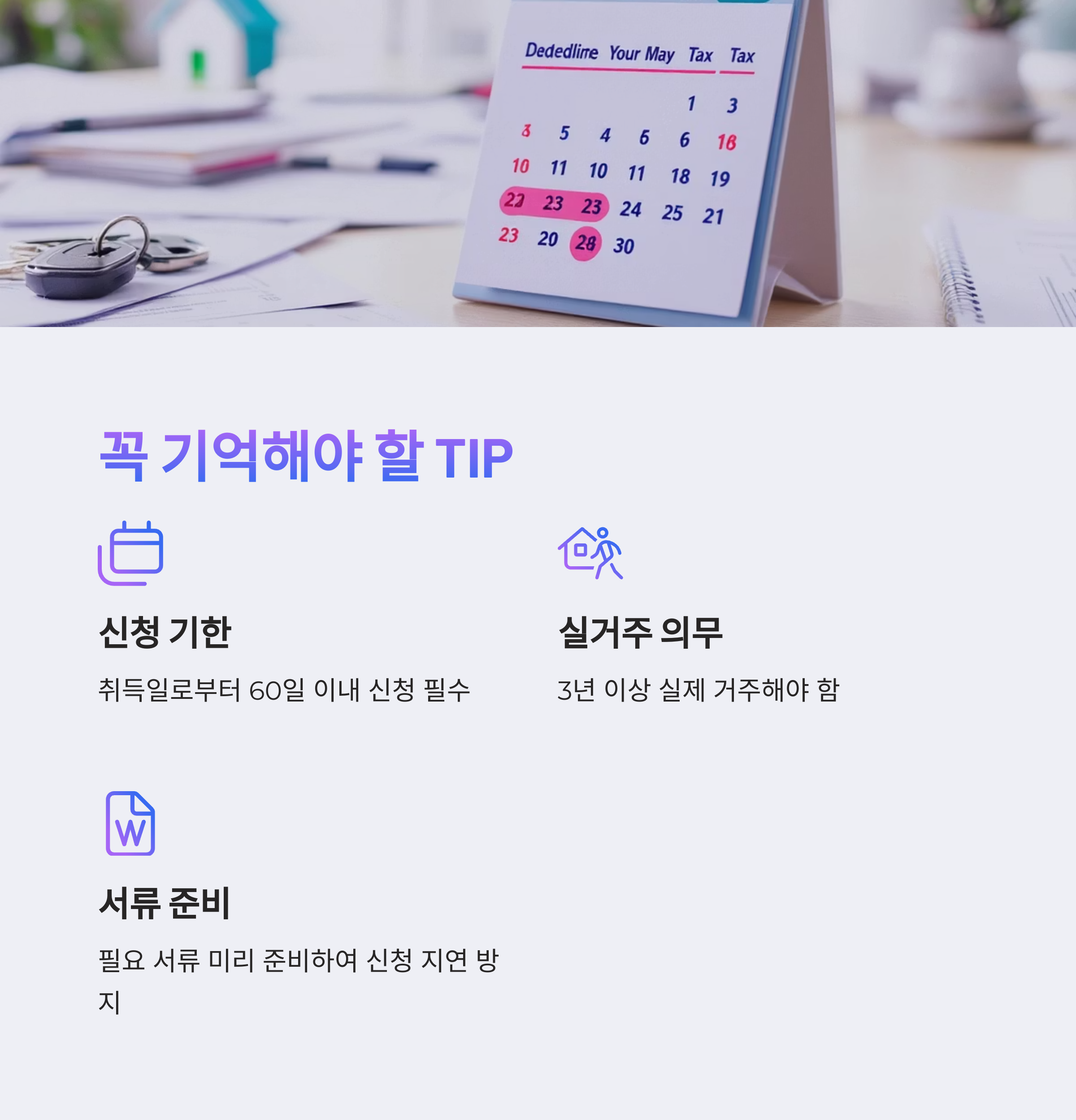 - 신청 기한: 주택 취득일(등기일 기준)로부터 60일 이내