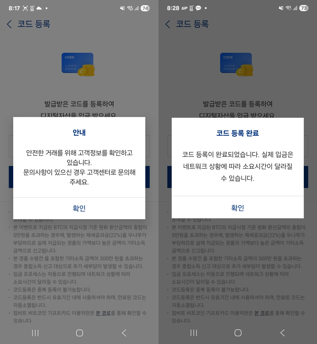 A. 업비트 가입 후 48시간 이내에 코드 입력을 완료해야 혜택을 받을 수 있습니다.