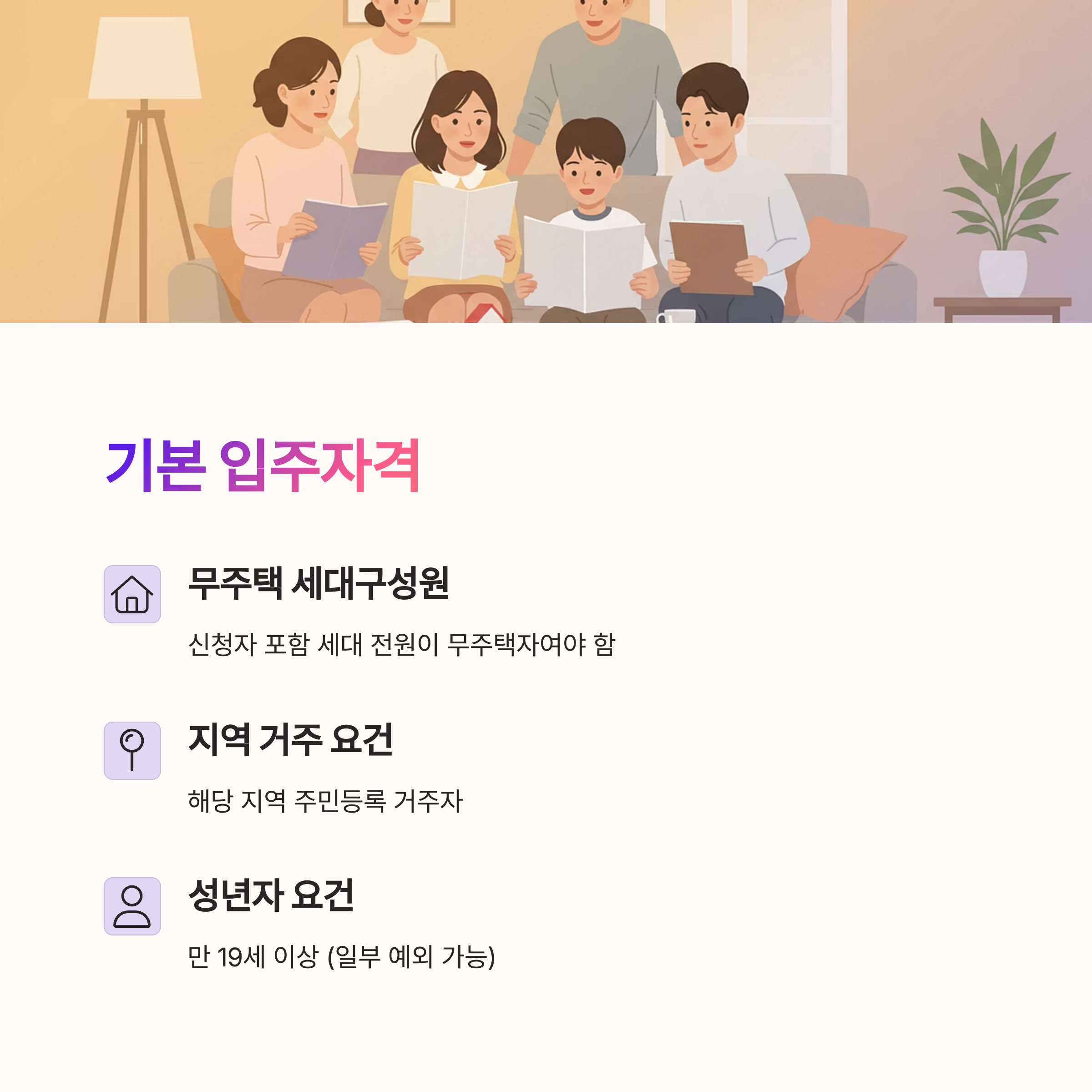 - 무주택 세대구성원: 신청자 포함, 세대 전원이 모집공고일 기준 무주택자