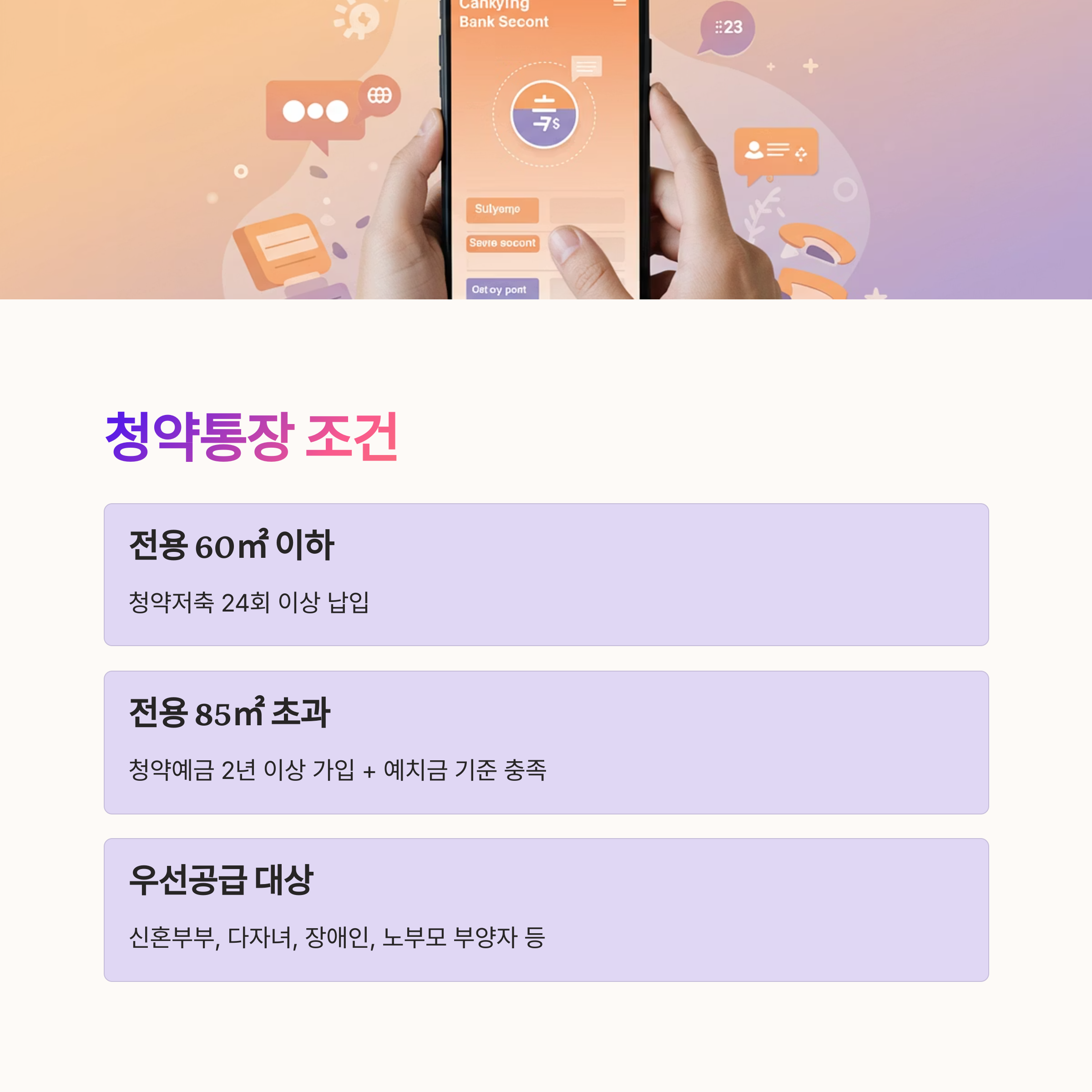 - 전용 60㎡ 이하: 청약저축 24회 이상 납입 등
