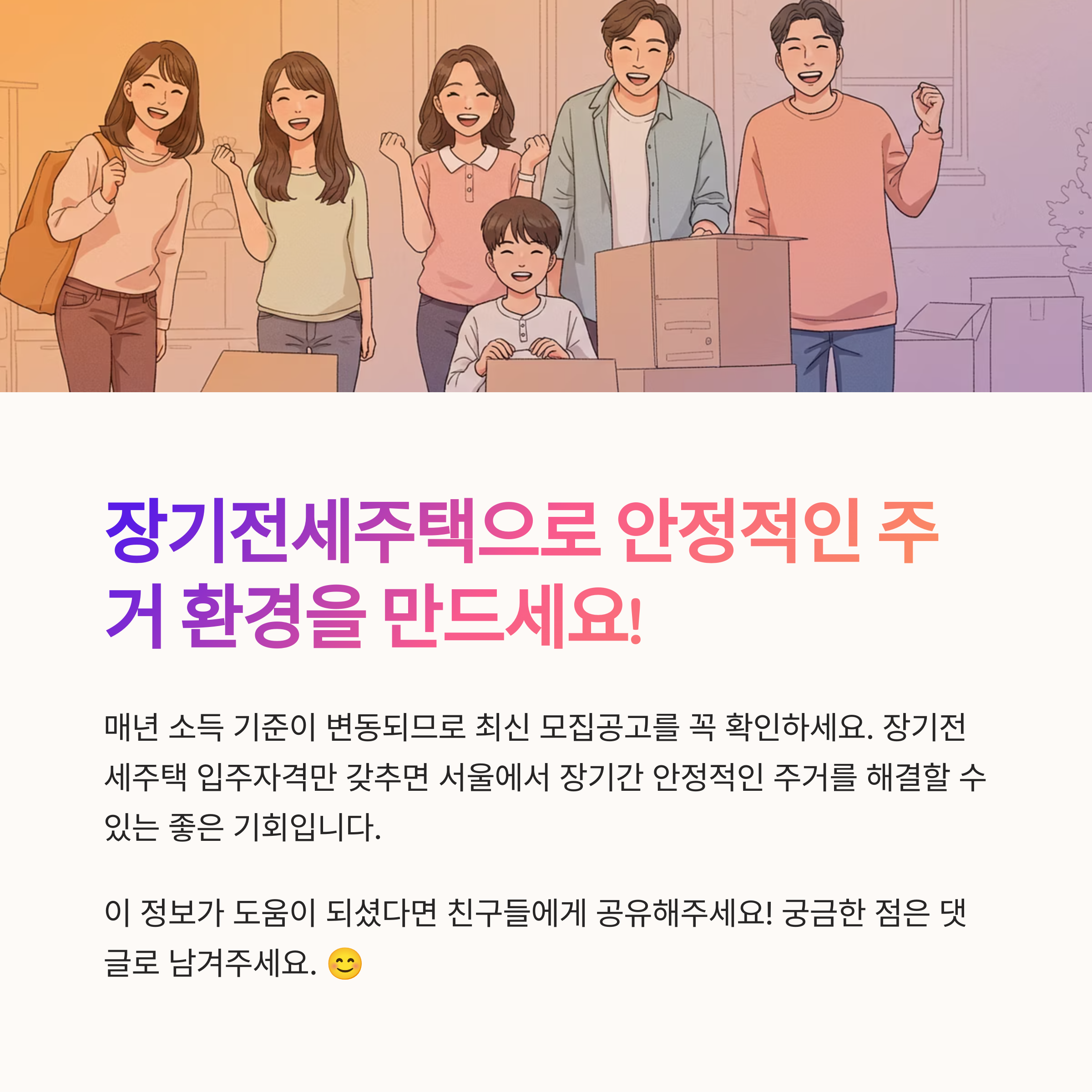 궁금하신 점은 지역별 모집공고 또는 SH·LH공사 홈페이지를 참고하세요. 장기전세주택 입주자격만 갖추면, 서울에서 장기간 안정적인 주거를 해결할 수 있는 좋은 기회입니다.