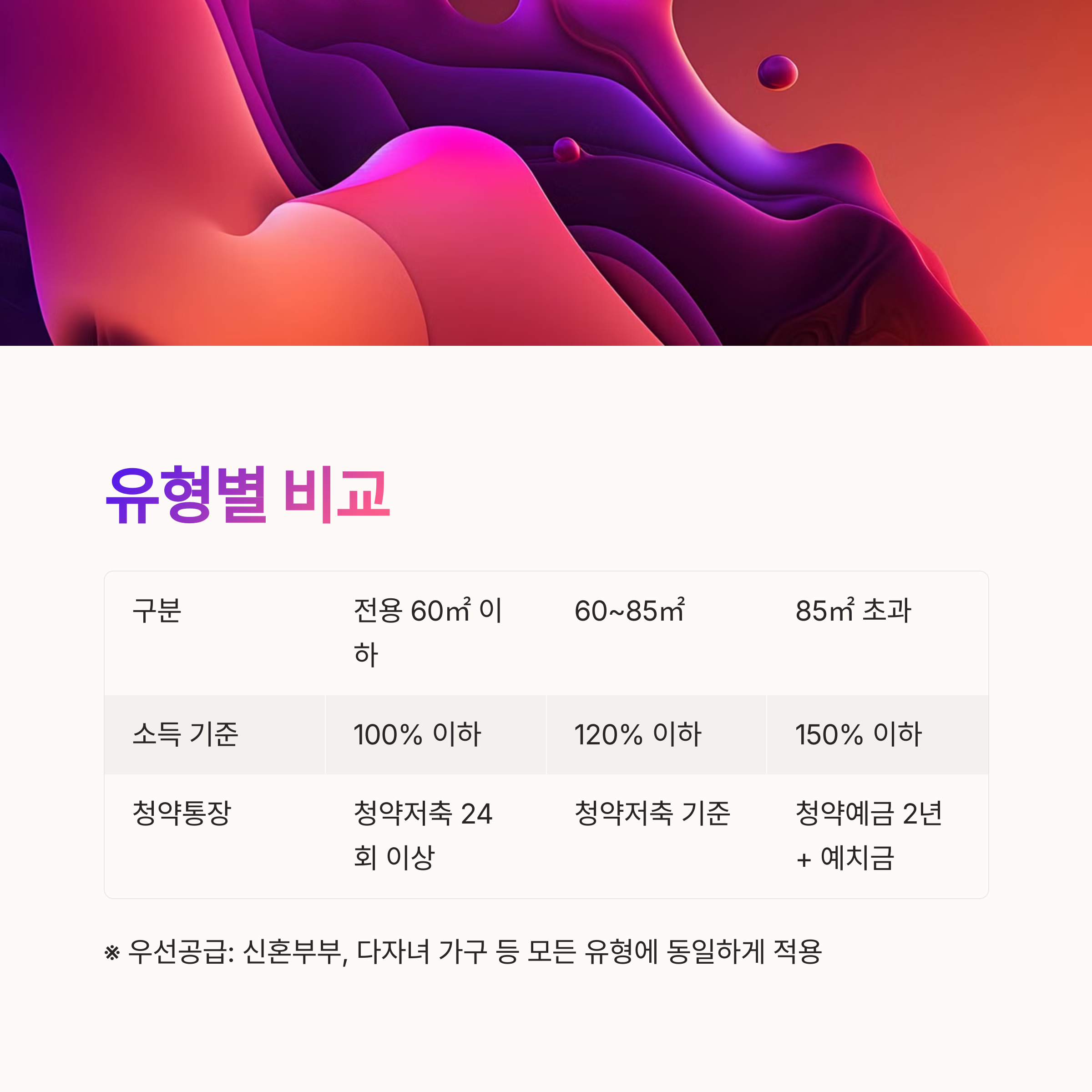 ※ 일부 유형은 신혼부부, 다자녀, 노부모 부양자 등 우선공급 대상에게 가점이 적용됩니다.